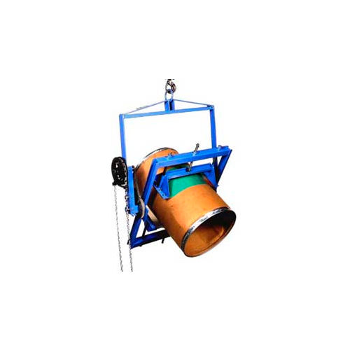 Adjustable to grip steel or fiber drum. Rubber faced grip pads are tightened by hand-crank to fit drum diameter. Model 186 for 15" to 23" diameter containers. Operator controls drum pouring by pull-chain driven gears. Capacity: 500 Lb. (227 kg)