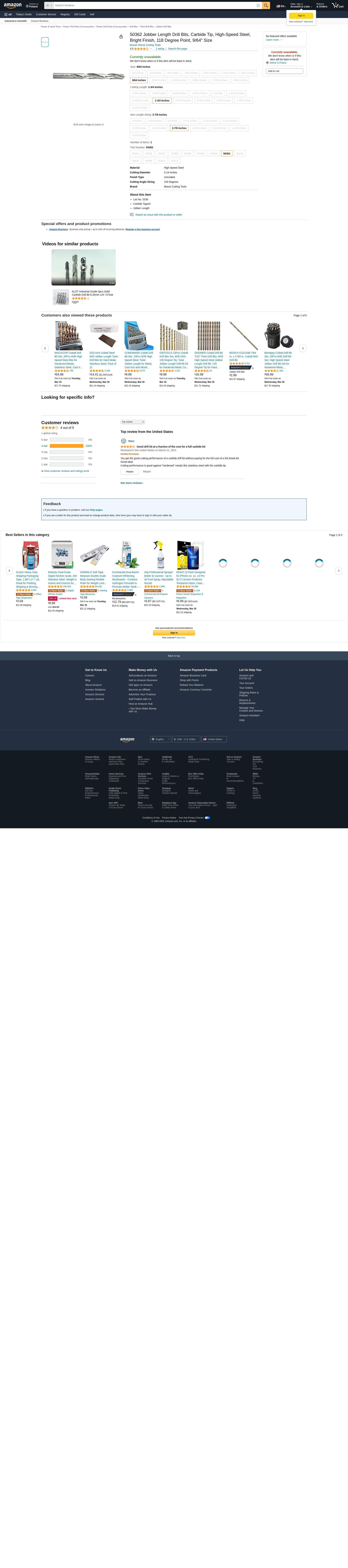 Morse Cutting Tools 50362 Jobber Length Drill Bits, Carbide Tip, High-Speed Steel, Bright Finish, 118 Degree Point, 9/64" Size