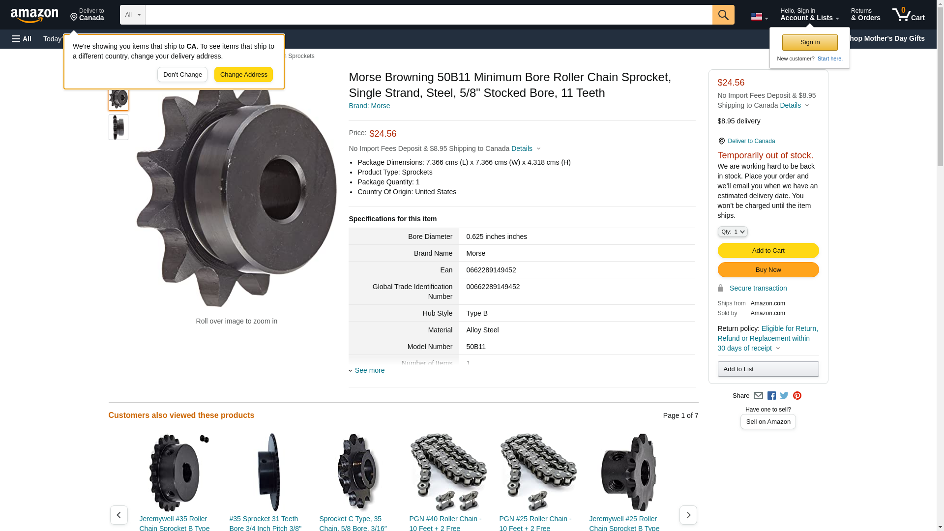 Morse Browning 50B11 Minimum Bore Roller Chain Sprocket, Single Strand, Steel, 5/8" Stocked Bore, 11 Teeth