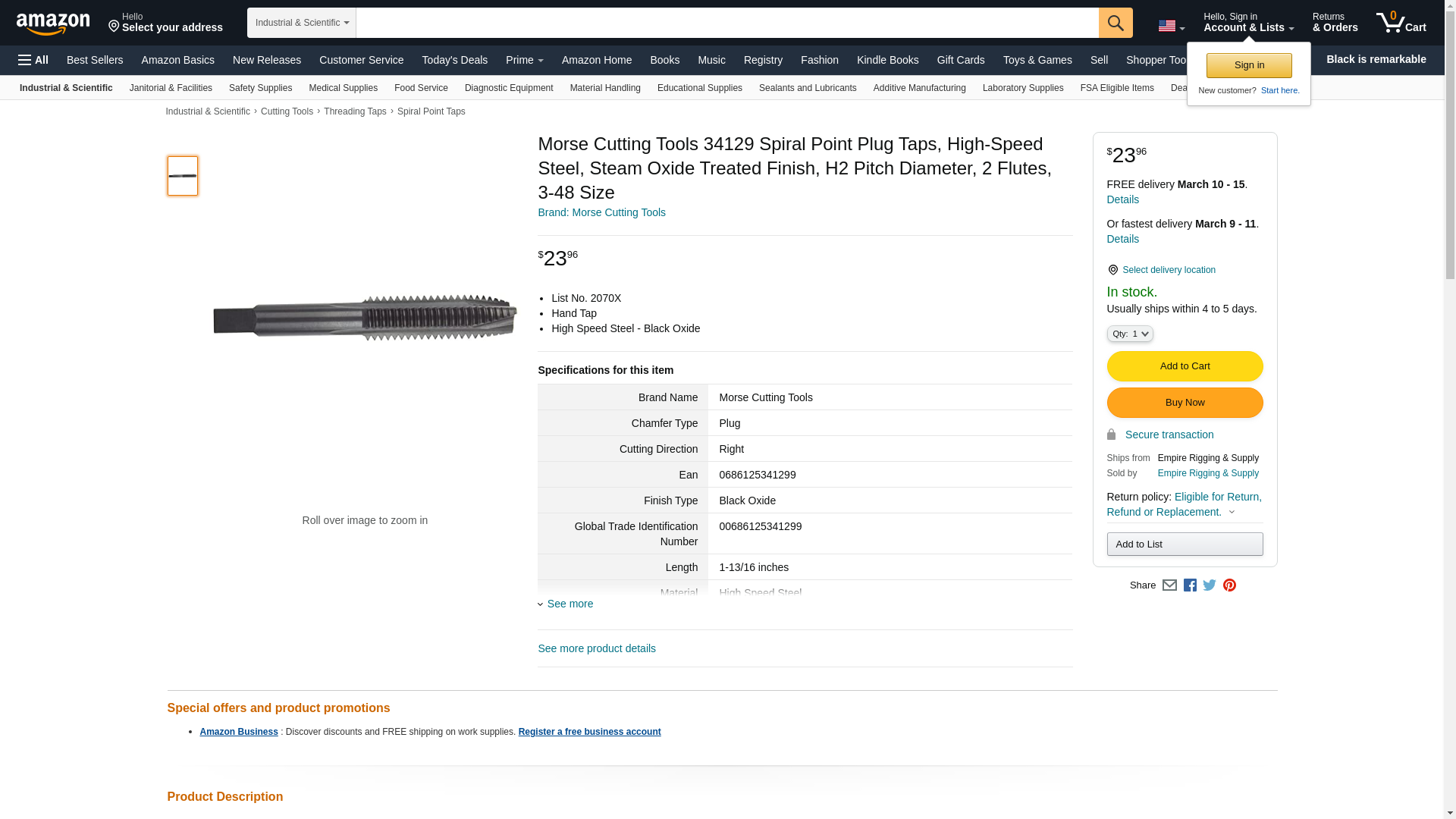 Morse Cutting Tools 34129 Spiral Point Plug Taps, High-Speed Steel, Steam Oxide Treated Finish, H2 Pitch Diameter, 2 Flutes, 3-48 Size