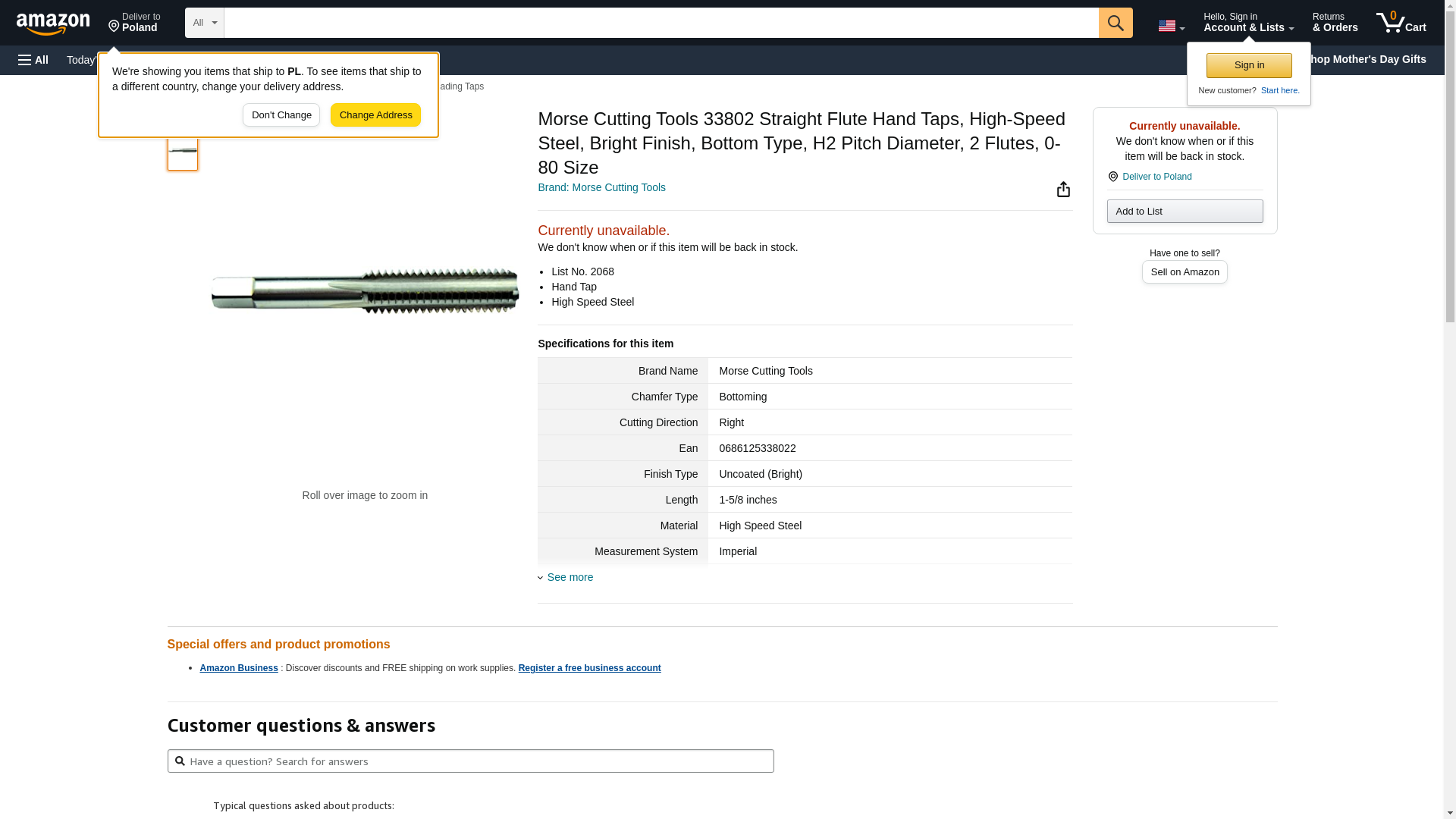 Morse Cutting Tools 33802 Straight Flute Hand Taps, High-Speed Steel, Bright Finish, Bottom Type, H2 Pitch Diameter, ...
