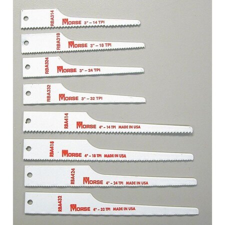 | Feature | Price For: Each Primary Saw Application: Metal Item: Reciprocating Saw Blade Set Height: 1/2" Material: Bi-Metal Shank: 1/2" Application: For Cutting Metal in Auto Body, Muffler and Metal Fabricating Shops Includes: (4) 3, 4" Long 14, 18, 24, 32 TPI Blades Item: Reciprocating Saw Blade Set Teeth per Inch: 14, 18, 24, 32 Back: Tapered |