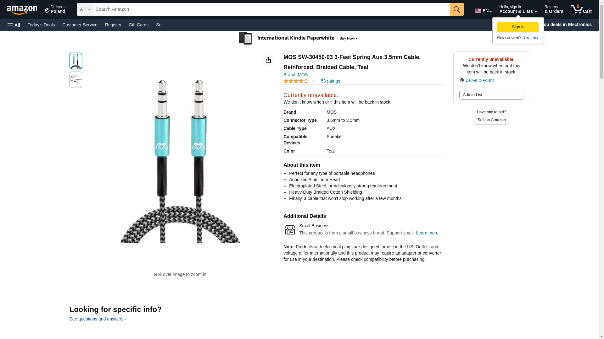 MOS SW-30450-03 3-Feet Spring Aux 3.5mm Cable, Reinforced, Braided Cable, Teal