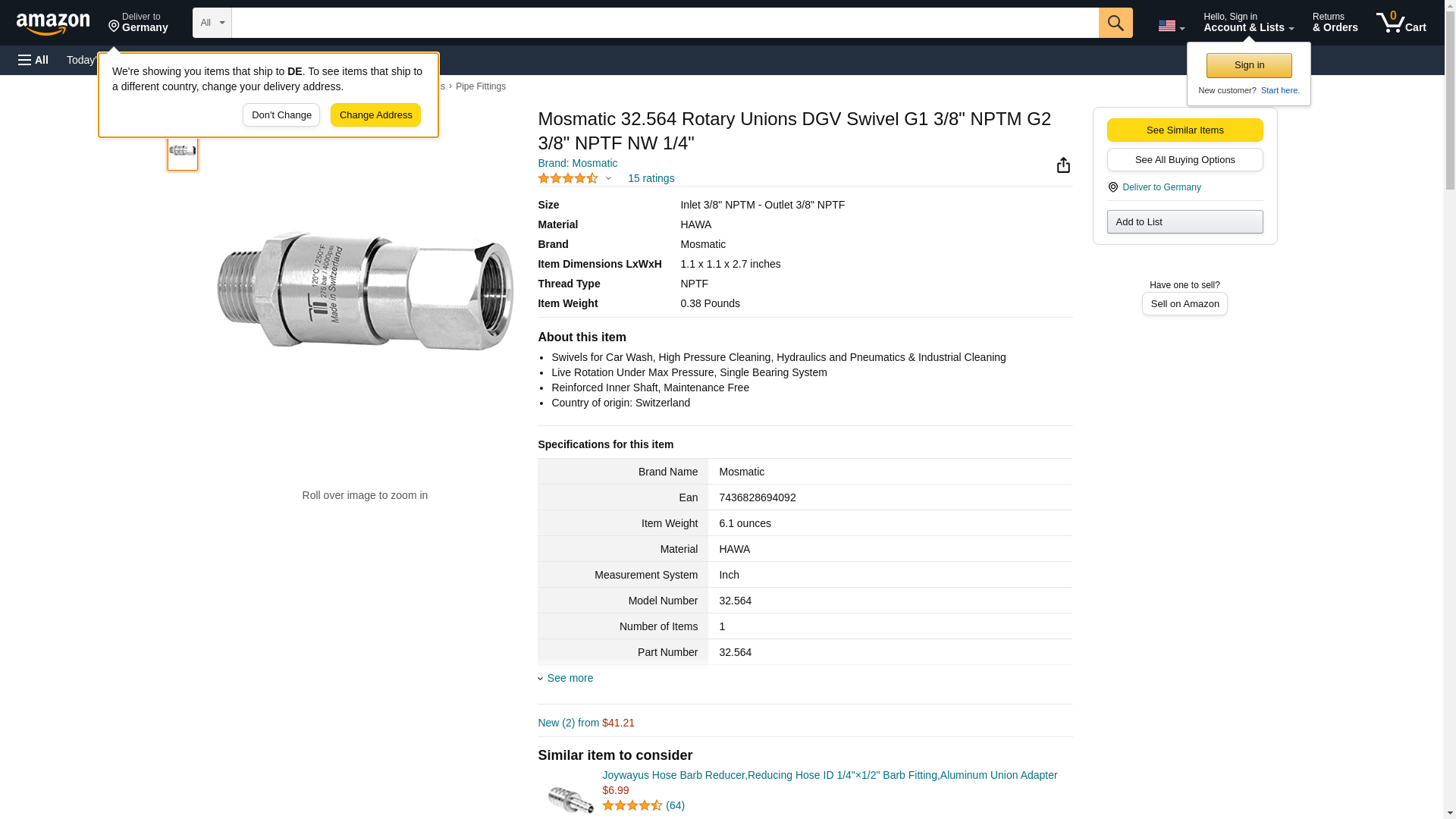 Mosmatic 32.564 Rotary Unions DGV Swivel G1 3/8" NPTM G2 3/8" NPTF NW 1/4", Silver