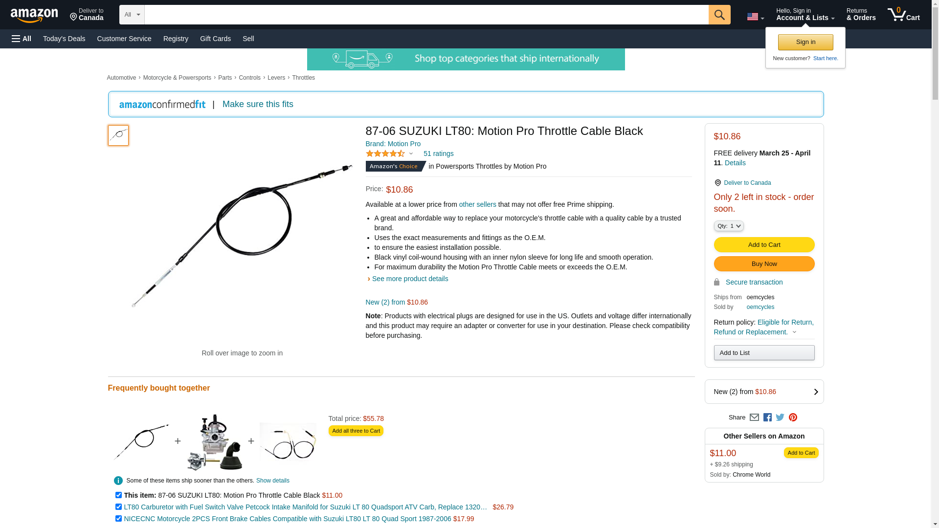 <LI>Black Vinyl Coil-Wound Housing</LI><LI>Meets or Exceeds O.E.M. Quality</LI><LI>Inner Nylon Sleeve for Longer Life and Smooth Operation</LI><LI>Cables Are Standard Length</LI><LI>Intended for Stock Carbs Unless Otherwise Noted</LI><BR></BR>Fits the Following Kawasaki Models:<LI>KFX80 2003-2006</LI><BR></BR>Fits the Following Suzuki Models:<LI>LT80 1987-2006</LI><BR></BR><LI><B>Please Note: The Image Displayed Is Representative of the Item, but May Vary Depending on Your Specific Model.</B></LI>