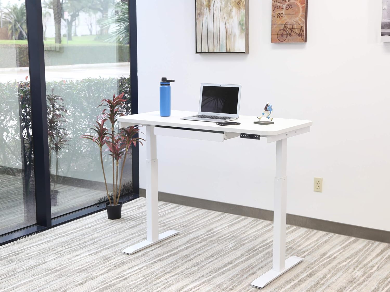 MotionWise 24x48 inch Desk with Drawer 28" to 48" with up to 4 Pre-Set Height Adjustments and USB Charge Port, 24x48, White Top with White Frame