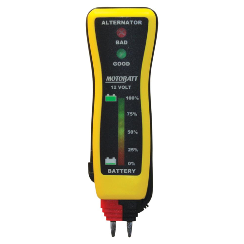 The perfect size 12V battery tester for a<br/>technicians pocket or tankbag, saddlebag or<br/>glove box<br/>Easy-to-read rainbow meter indicates percentage of battery charge and good/bad alternator voltage range<br/>Use with probes to test a battery in a vehicle, or remove the black (negative) cable from the fixed location for on-battery terminal testing at a counter or bench
