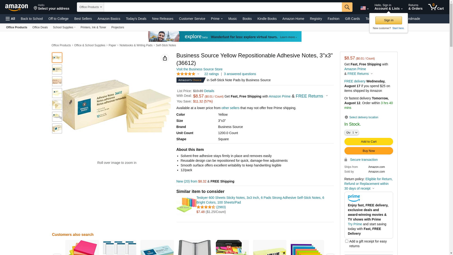 Business Source Yellow Repositionable Adhesive Notes, 3"x3" (36612)