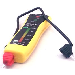 The perfect size 12V battery tester for a.<br> technicians pocket or tankbag, saddlebag or.<br> glove box.<br> Easy-to-read rainbow meter indicates percentage of battery charge and good/bad alternator voltage range.<br> Use with probes to test a battery in a vehicle, or remove the black (negative) cable from the fixed location for on-battery terminal testing at a counter or bench.