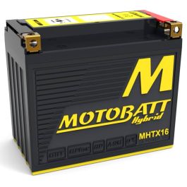 Motobatt Hybrid is the worlds first Optimum Powersport battery. Designed to out perform Lithium batteries with perfect stability, huge linear cranking performance and reserve capacity. The unique CBC and PCB boards protect the battery from overcharge, over discharge, and overheating. Optimizing the two chemistries we provide truly outstanding performance in all weather conditions with increasing performance after repeated starts. Voltage is matched to the original charging system and no special charger is required. Generally Lithium batteries alone are a poor choice since they are not designed for the OE 12V charging system causing lack of stability and premature failures. They also lack Reserve capacity to run accessory loads. Motobatt addresses these issues thus making the most reliable and truly powerful Powersport battery today. 3 YEAR WARRANTY Battery Type - MHTX16 Voltage -12 CCA-18C - 350 Capacity (10HR) - 16Ah Weight - 2.50kg / 5.5lbs Dimensions (in / mm) - L:5.94(151) W: 3.43(87) H: 5.11(130) TW: 3.94(100) TH: 5.94(151)