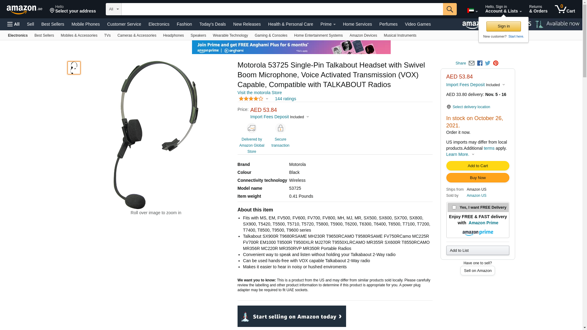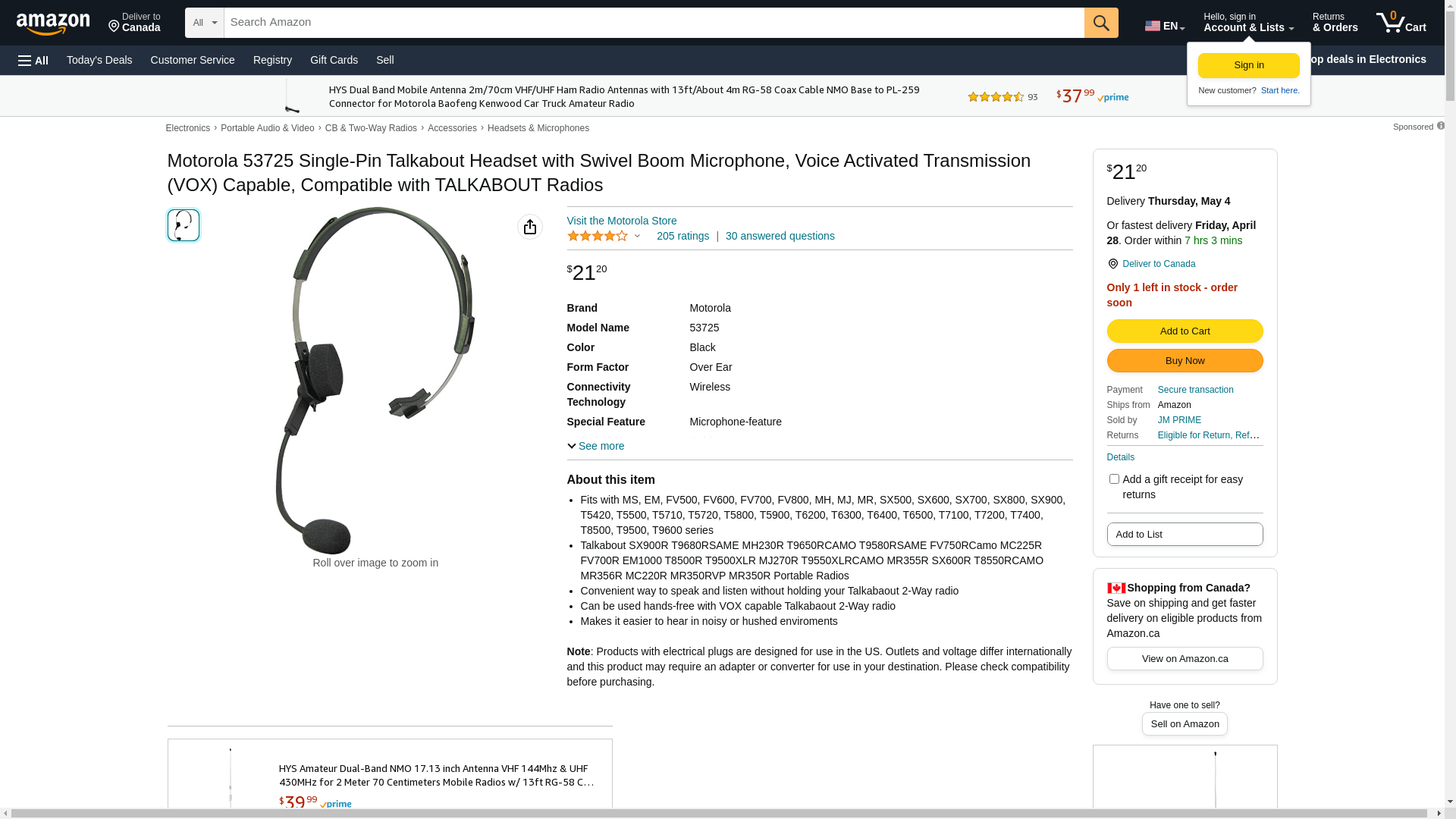 Motorola 53725 Single-Pin Talkabout Headset with Swivel Boom Microphone, Voice Activated Transmission (VOX) Capable, Compatible with TALKABOUT Radios