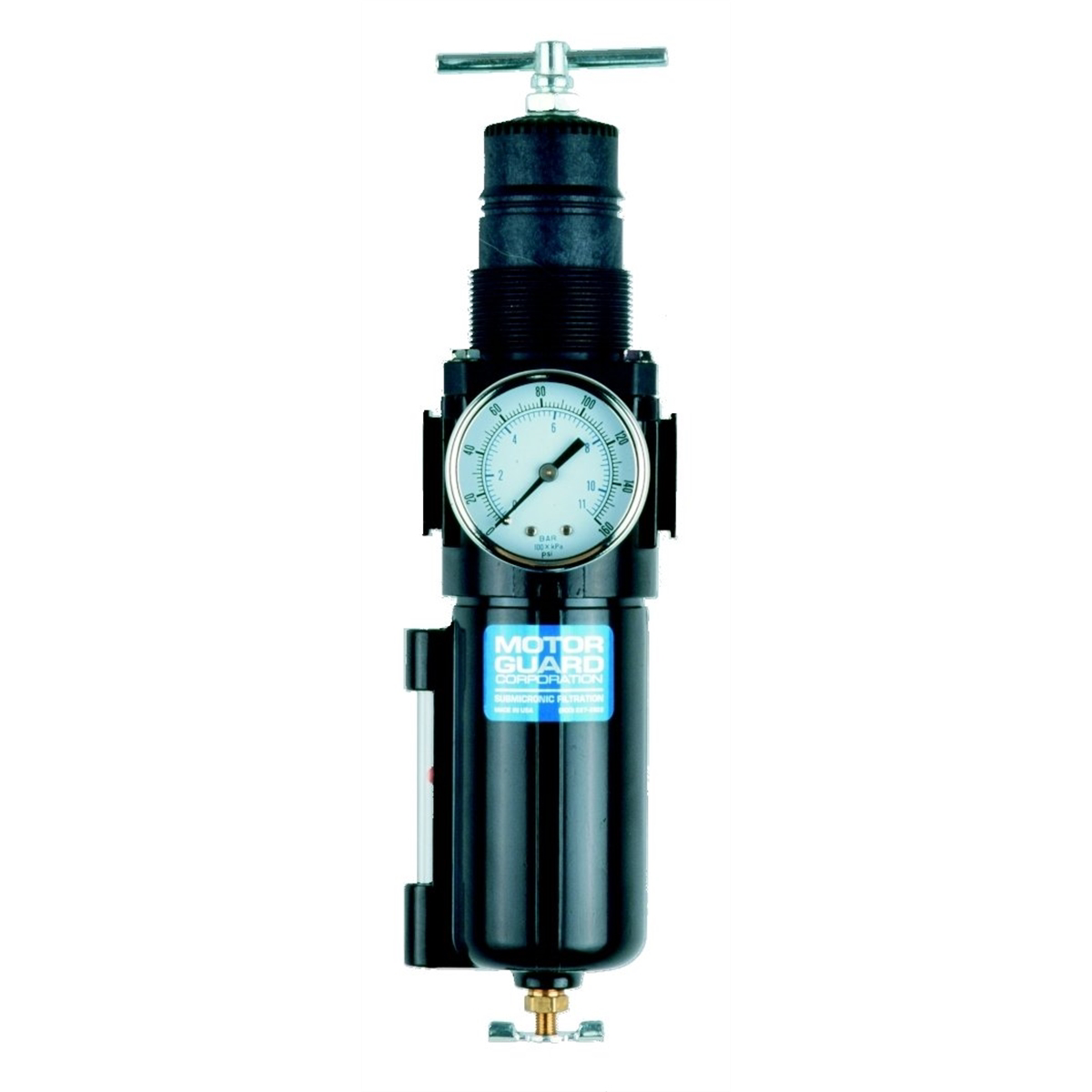 MCAC4525 Features: -A compact, high flow regulator / filter for point of use air control.-_ in. 100 CFM.-Site glass.-T-handle with manual drain.-Designed for every Ail line drop in the shop.-Economical Low Profile Air Control Unit Regulator/Filter. Warranty: -30 day warranty on material and workmanship.