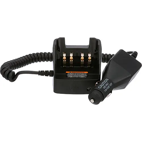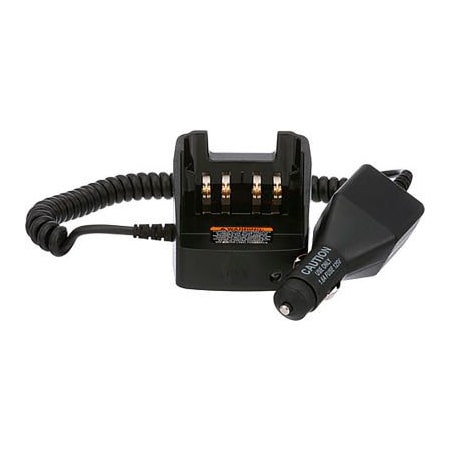 This compact travel charger allows the radio to be used while rapid charging in the charger base. Unit includes a voltage regulated vehicular charger adapter, custom charger base, mounting bracket and coil cord and plugs directly into the vehicle's cigarette lighter adapter.