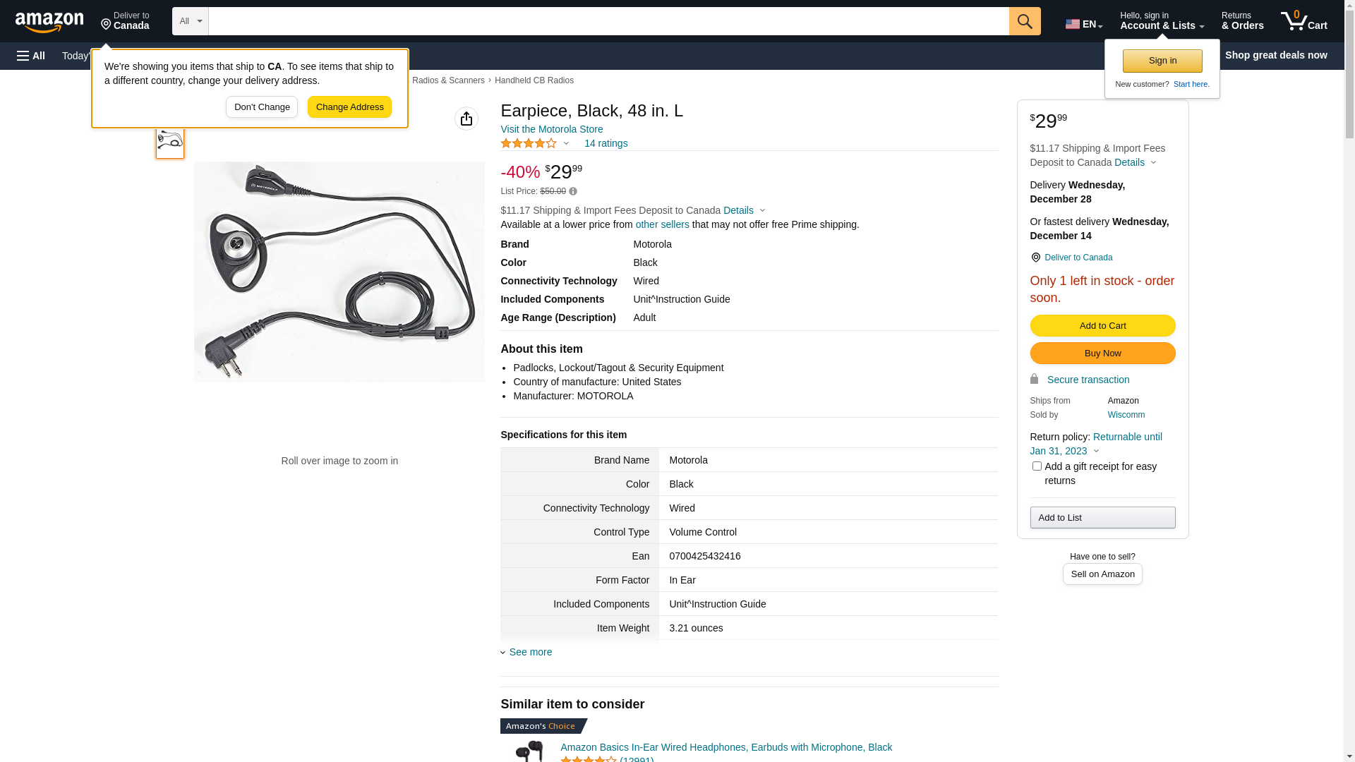 Earpiece, Product Type Earpieces, Compatible Radio Brand Motorola, Compatible Radio Series BPR40, CP200d, Compatible Radio Manufacturer Model Number HK1847A, Compatible Radio Grainger Model Number 4PJD4, Earpiece Style D-Ring, Number of Ears One, Number of Wires 1, Push To Talk Yes, Microphone Location Shirt/Lapel, Radio Connector Type M1, Earpiece Connection Type Wired, Earpiece Color Black, Cord Length 48 in, Volume Control No, Includes Microphone, Overall Length 1 5/8 in, Overall Width 1/4 in
