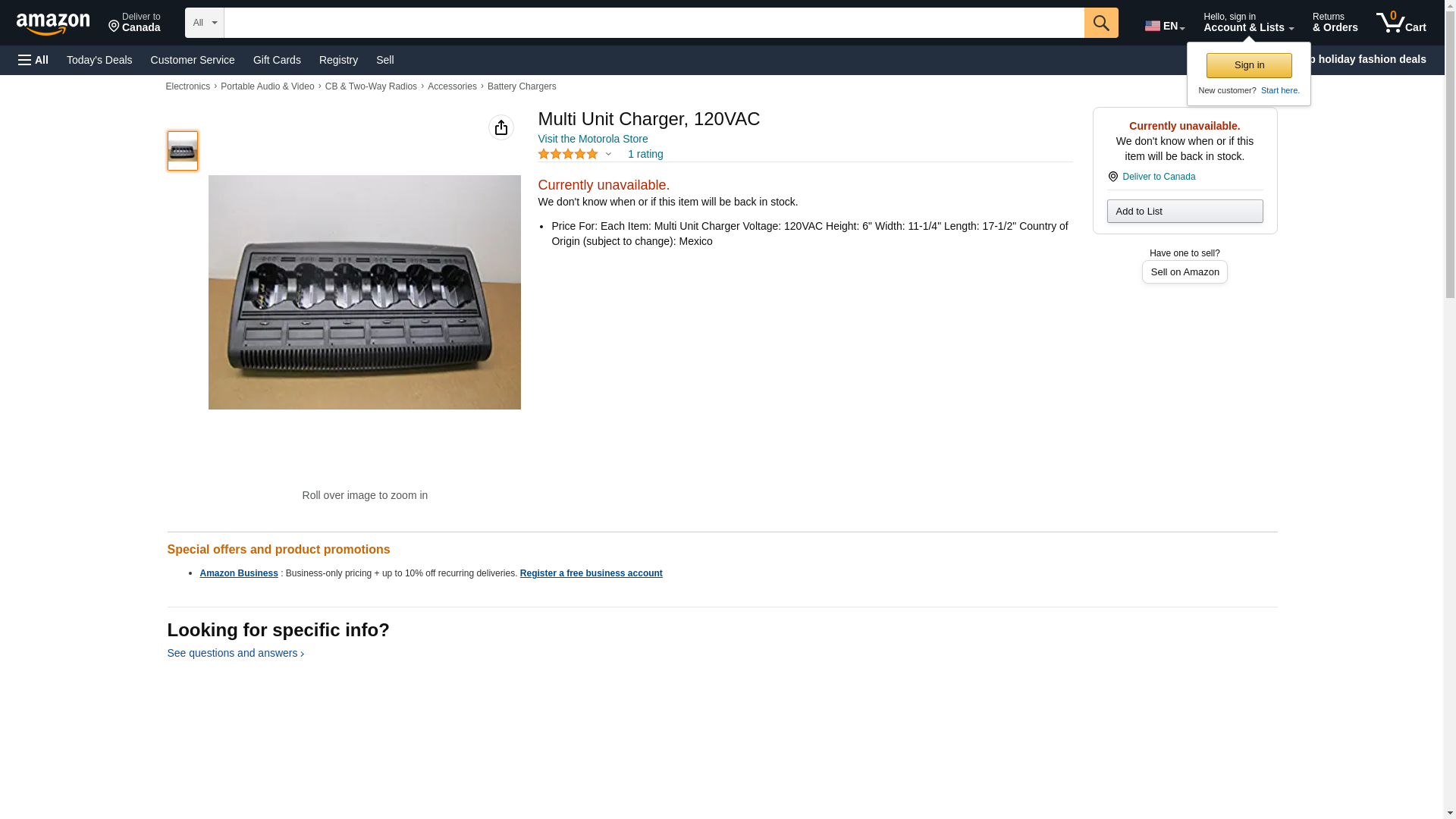 - <b>Price For:</b> Each <b>Item</b>: Multi Unit Charger <b>Voltage</b>: 120VAC <b>Height</b>: 6" <b>Width</b>: 11-1/4" <b>Length</b>: 17-1/2" <b>Country of Origin (subject to change)</b>: Mexico