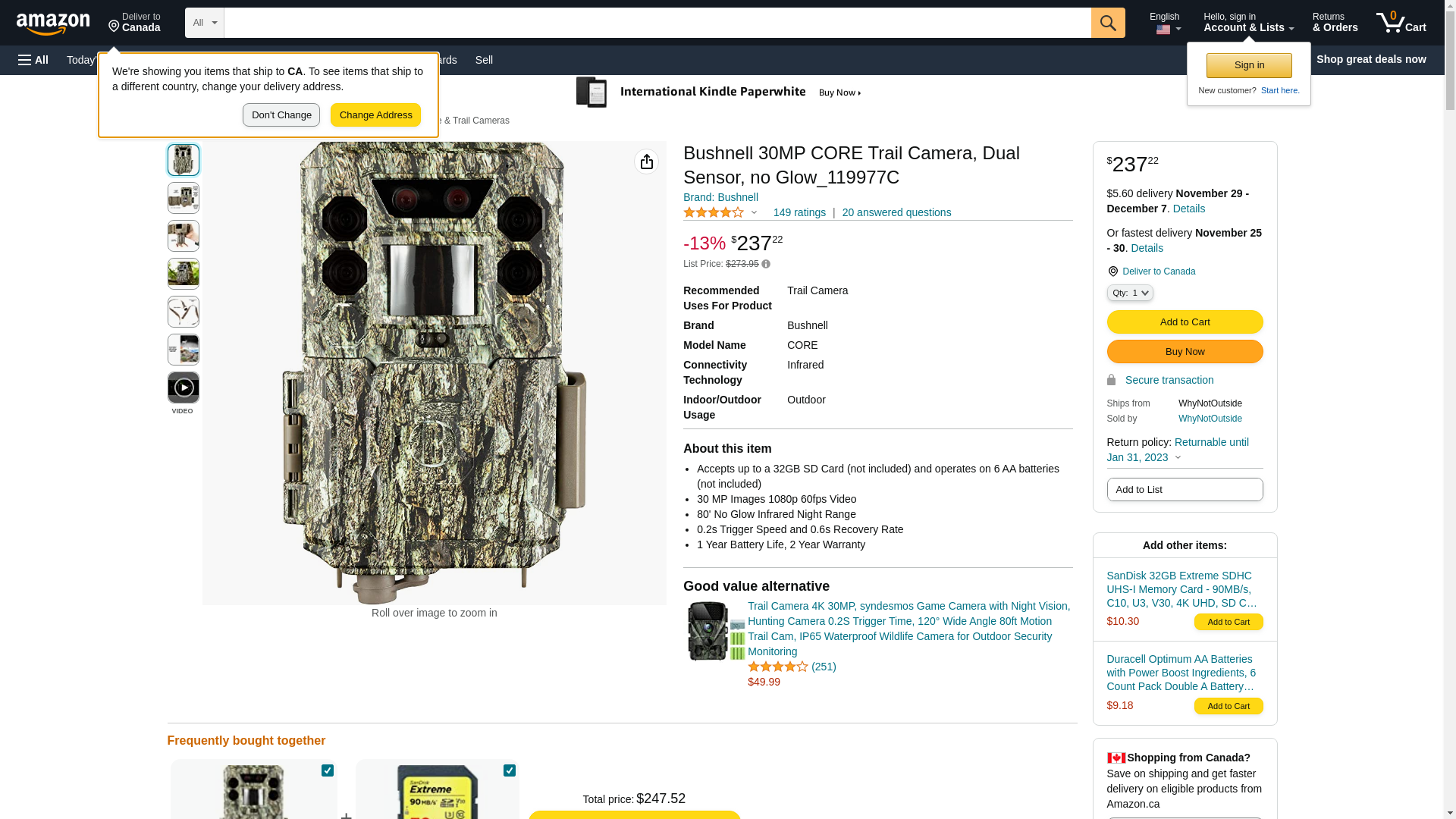 Bushnell 30MP CORE 1080p Trail Camera, Dual Sensor, no Glow_119977C
