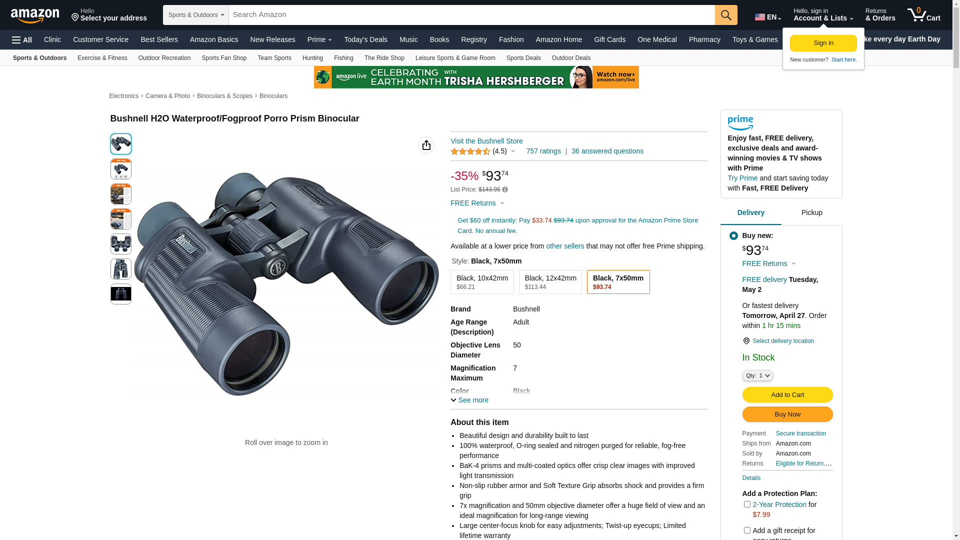 - Includes: Bushnell H2O 7x50 Porro Prism BAK-4 Waterproof Binoculars | Binoculars Case | Neck Strap | Lens Caps | Lens Cleaning Cloth | Limited Warranty
