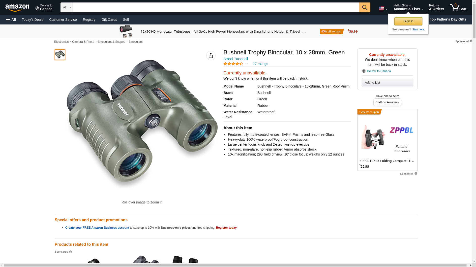 Bushnell Trophy Binocular, 10 x 28mm, Green