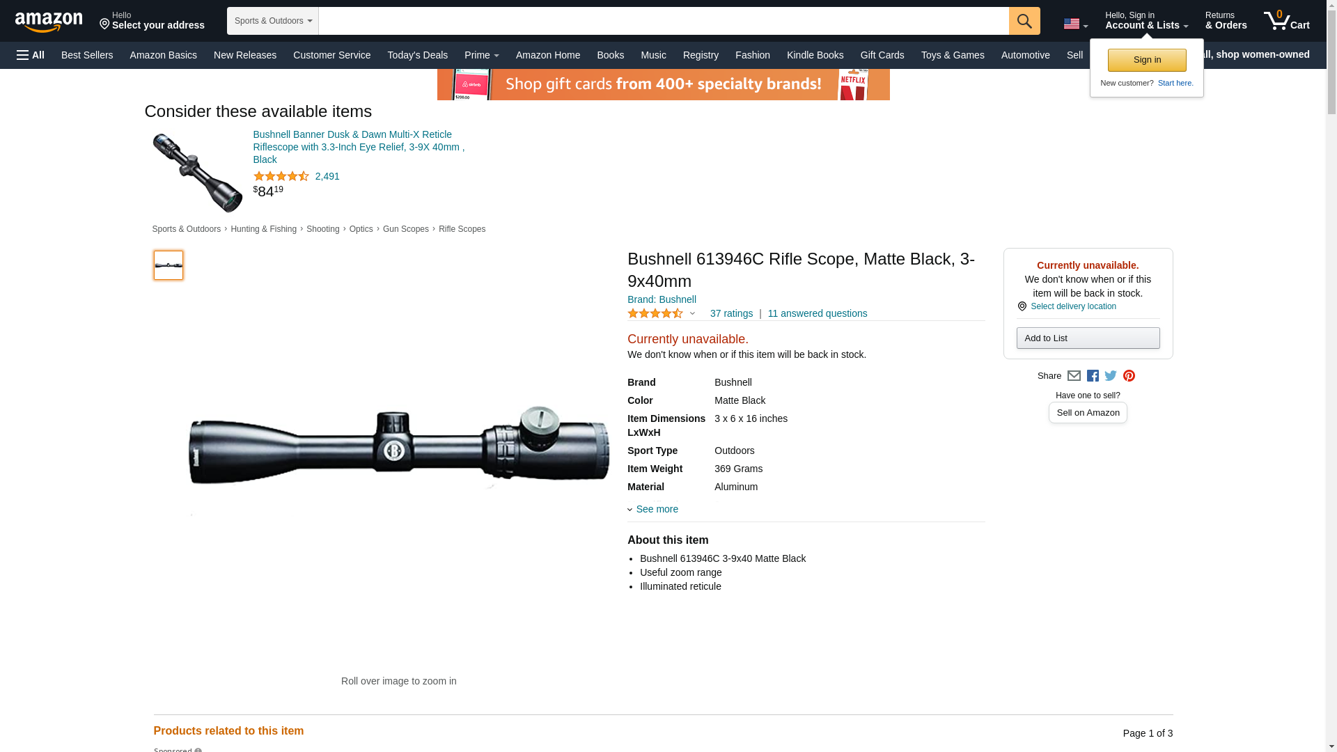 Bushnell 613946C Rifle Scope, Matte Black, 3-9x40mm