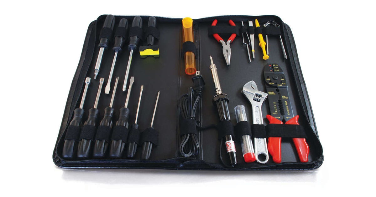 21-Piece Computer Tool Kit... A complete tool kit for computer maintance and upgrades. One 3/16in nut driver, One 1/4in nut driver, One 3-claw part holder, One tweezers, One T-10/T-15 reversible screwdriver, One 1/8in flat screwdriver, One 1/4in flat screwdriver, One 3/16in flat screwdriver, One IC extractor, One 14-16 pin IC inserter, One #0 Phillips screwdriver, One #1 Phillips screwdriver, One 25 Watt soldering iron, One solder reel, One spare parts tube, One 6in adjustable crescent wrench, One 5in needle nose pliers, One 8in wire cutter, One reverse-action tweezers.