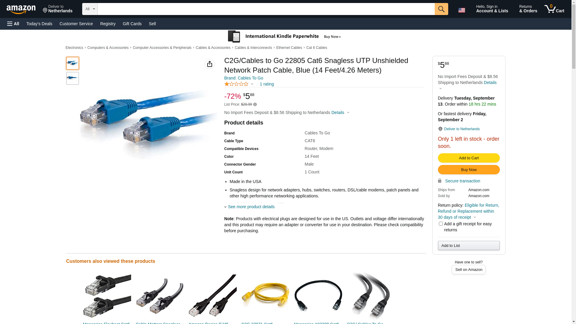 C2G/Cables to Go 22805 Cat6 Snagless UTP Unshielded Network Patch Cable, Blue (14 Feet/4.26 Meters)