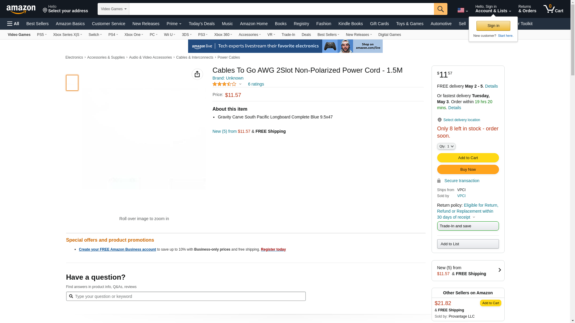 6' NON-POLARIZED POWER CORD BLACK. Non-Polarized Power Cord (6 Feet, Black).