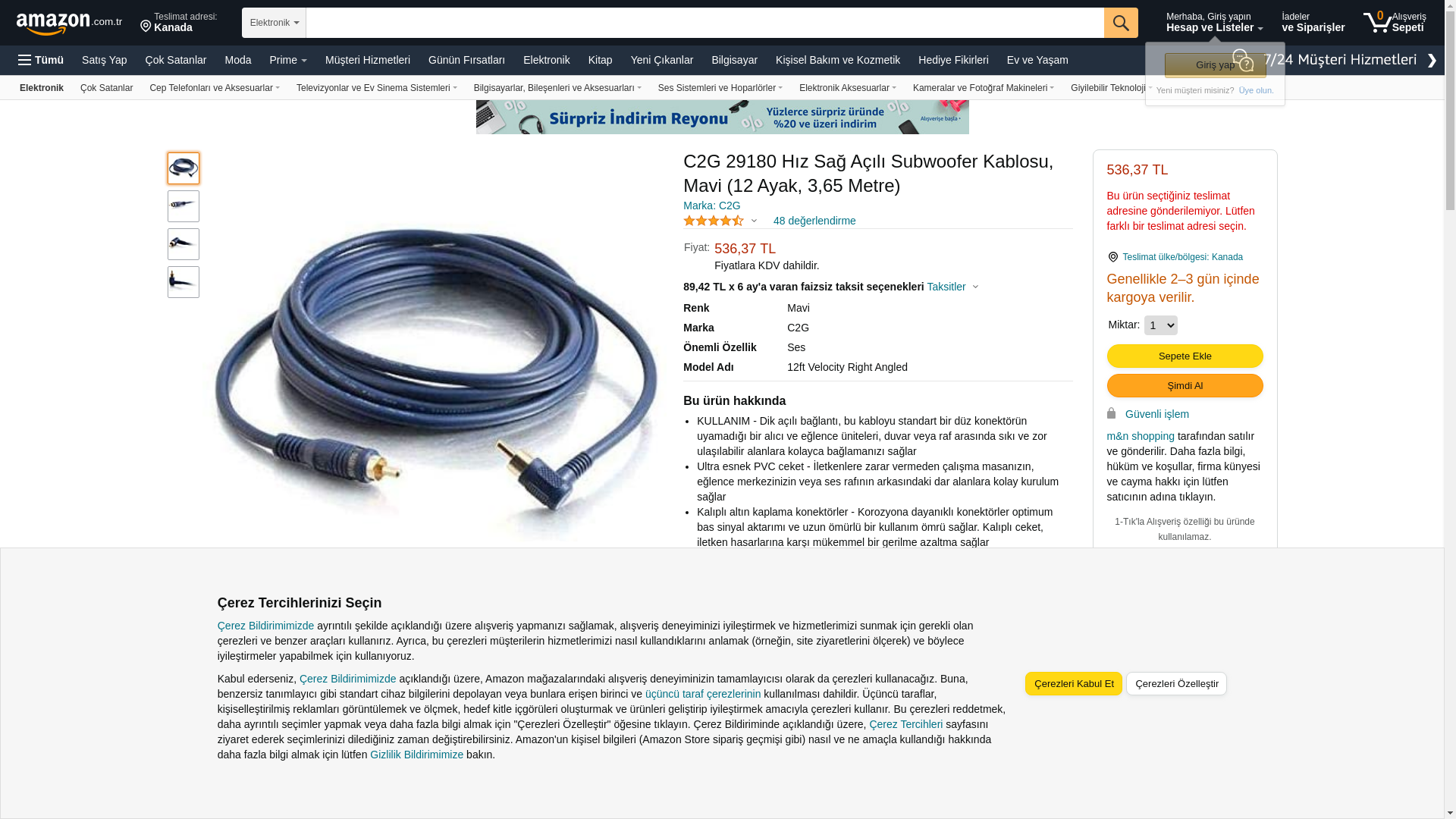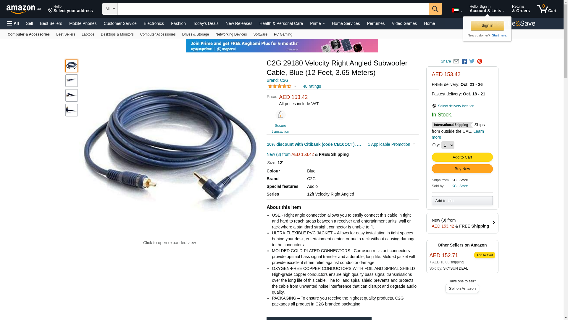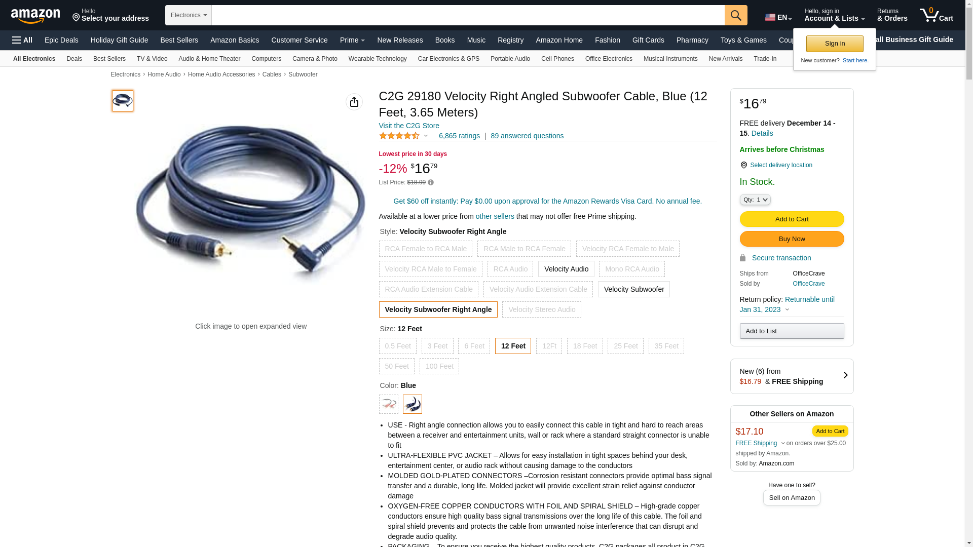 C2G 29180 Velocity Right Angled Subwoofer Cable, Blue (12 Feet, 3.65 Meters)
