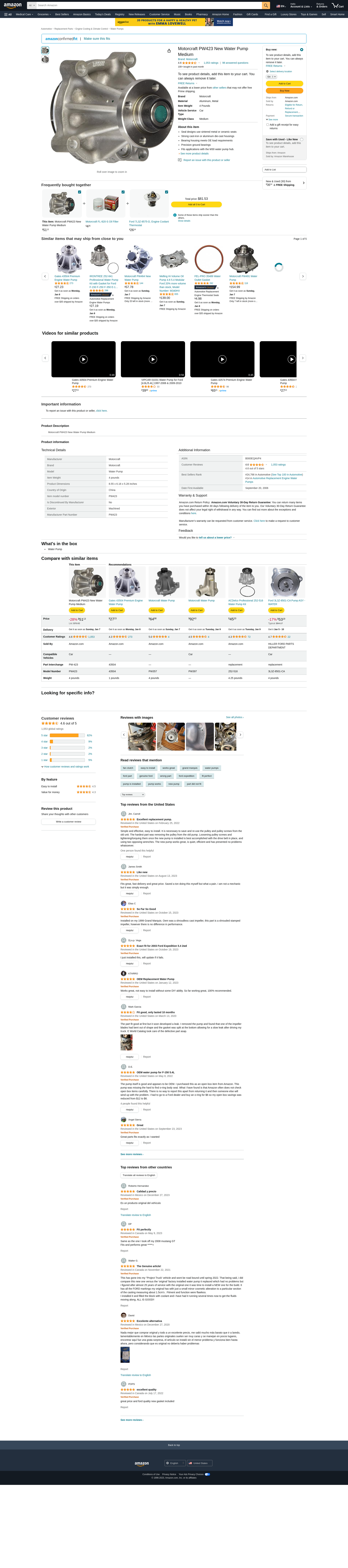 Motorcraft PW423 New Water Pump Medium