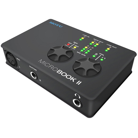 <strong>A complete solution<br />Everything you need to make world-class recordings</strong><br />The MicroBook II provides simultaneous inputs for a microphone, a guitar, and a keyboard or other stereo line level device. The mic preamp delivers neutral coloration and pristine sound, with 20 dB pad and 48V phantom power for condenser mics. Programmable outputs provide flexible monitoring options.</p><p><strong>Ultra-compact size<br />Take it with you anywhere</strong><br />The MicroBook II is an impressively small 5.5 by 3.6 by 1.25 inches, which means that it slides easily into your backpack - or a large pocket. <br />It also sits nicely next to your laptop or desktop computer.</p><p><strong>Studio-grade sound<br />Engineered for the discriminating ear</strong><br />The MicroBook II has been engineered with MOTU's renowned, award-winning audio interface technology, which delivers the uncompromising audio quality and rock-solid performance MOTU interfaces are known for worldwide. You can always record and mix with confidence, even in most demanding professional recording situations, knowing that decades of engineering experience are behind you, every step of the way. The MicroBook II delivers measured audio specs that rival interfaces costing hundreds more.</p><p><strong>High-speed USB 2.0<br />High bandwidth and low latency</strong><br />The MicroBook II can record and play all channels simultaneously, and high-speed USB 2.0 provides plenty of bandwidth, even at 96 kHz.</p><p><strong>Flexible volume control<br />Digital encoders push and turn</strong><br />The two digital rotary encoders not only look good, they feel good, too. Push the volume knob repeatedly to cycle among the main outs, headphones, or both, as indicated by the LEDs. For the mic input, adjust trim and toggle 48V phantom power or the -20 dB pad. Hands-on control is immediate and intuitive.</p>