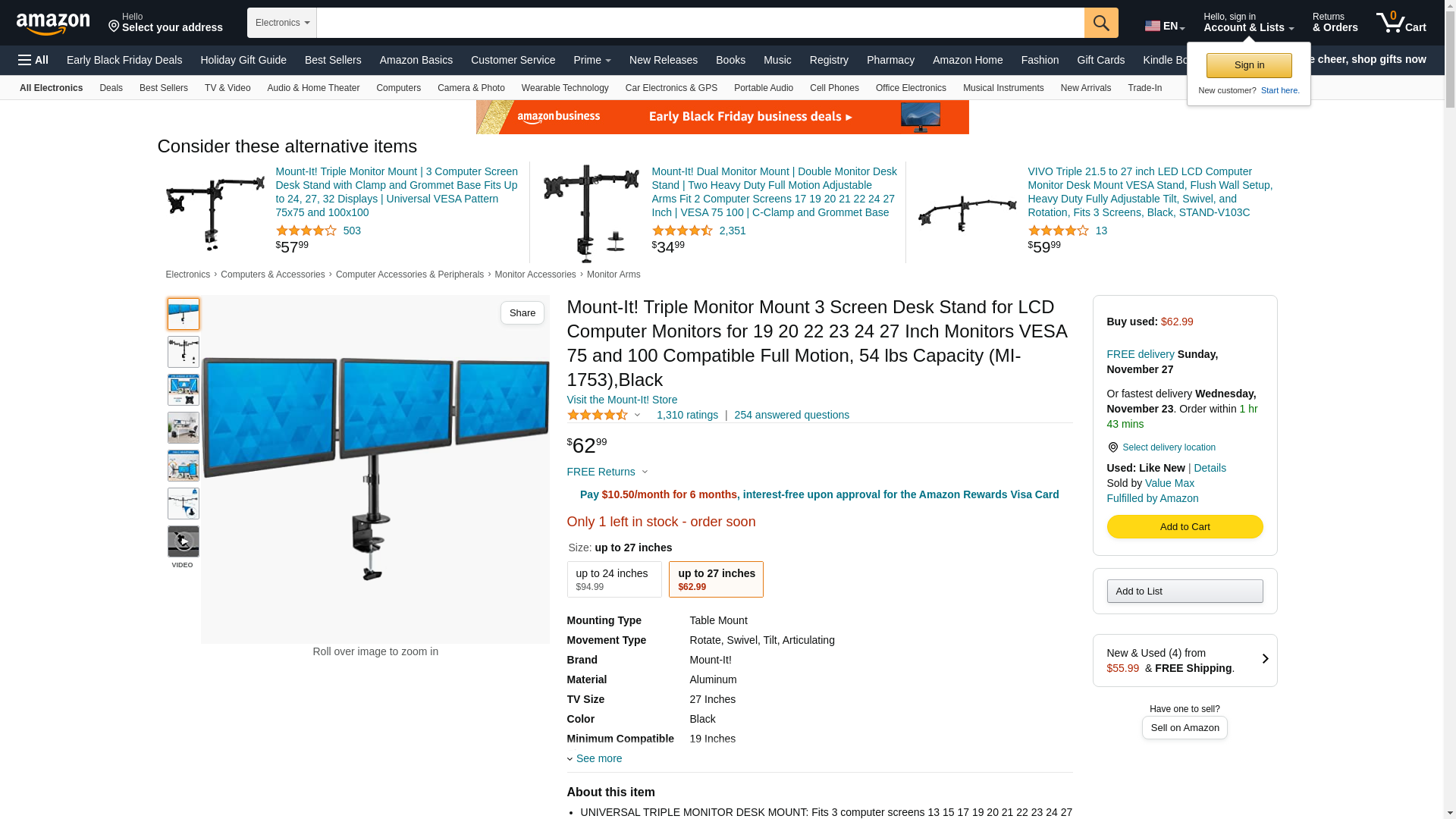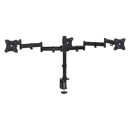 <b>Ergonomic and Versatile</b> <br> <br> Mount-It! MI-1753 triple arm (horizontal) monitor mount and stand allows you to clear out your desk space, while providing ergonomic monitor installation height. Say good bye to neck and should pain and increase your productivity with three screens. <br> Heavy duty stand and pole design makes this three monitor mount sturdy. Economical and dependable, mechanical monitor arms allow several height options for placing your monitor in the best ergonomic position, while offering more desktop space. <br> <br> The double link swing arms that support the monitors can be adjusted on the vertical tube for the best height adjustment. The arms and the base come with integrated cable management feature. Cable management system keeps cords organized. <br> <br> The heavy duty weighted metal base as well as the grommet mechanism secures the mount to the desk. The arms that support the monitors can be adjusted on the vertical tube for the best height adjustment. Articulating arms on the sides allow swivel function up to 360 degrees with 15 degrees of tilt at the mounting panel. <br> <br> <b>Specifications:</b> <br> <br> 66 lbs total carrying capacity. 22 lbs for each monitor. <br> VESA 75 and VESA 100 bolt pattern compatible. <br> Made from high grade steel and aluminum. <br> Mount base can be connected to desks up to 4 inches thick. <br> The monitors can be installed in either portrait or landscape mode, with interchangeability without having to remove monitors. <br> Kit includes the mount, hardware kit and installation instructions. <br> It is the ideal desk mount for office, reception areas, hospital, retail environments.