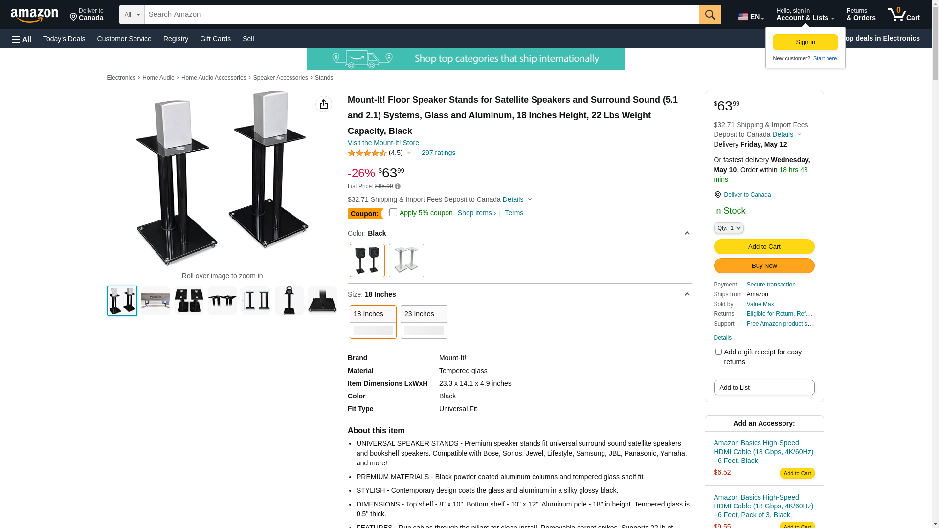 Mount-It! Floor Speaker Stands for Satellite Speakers and Surround Sound (5.1 and 2.1) Systems, Glass and Aluminum, 18 Inches Height, 22 Lbs Weight Capacity, Black