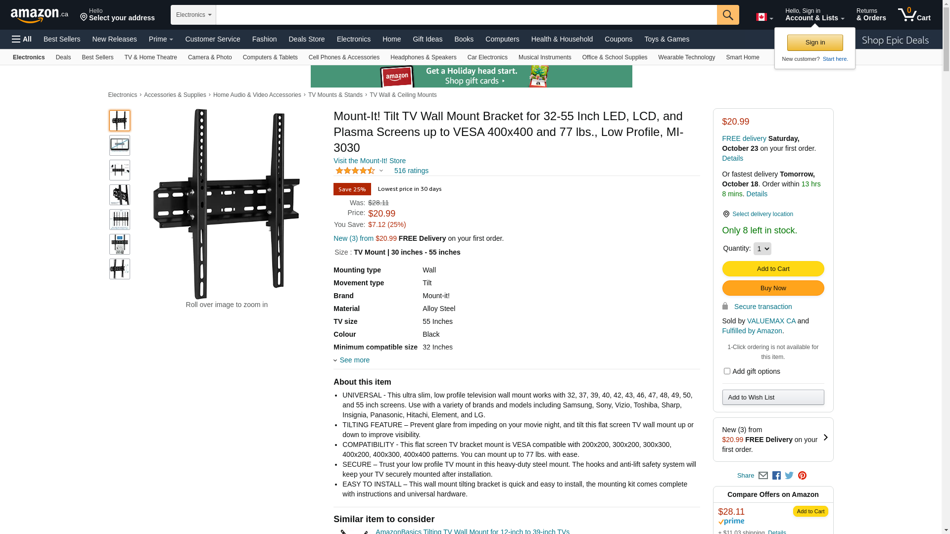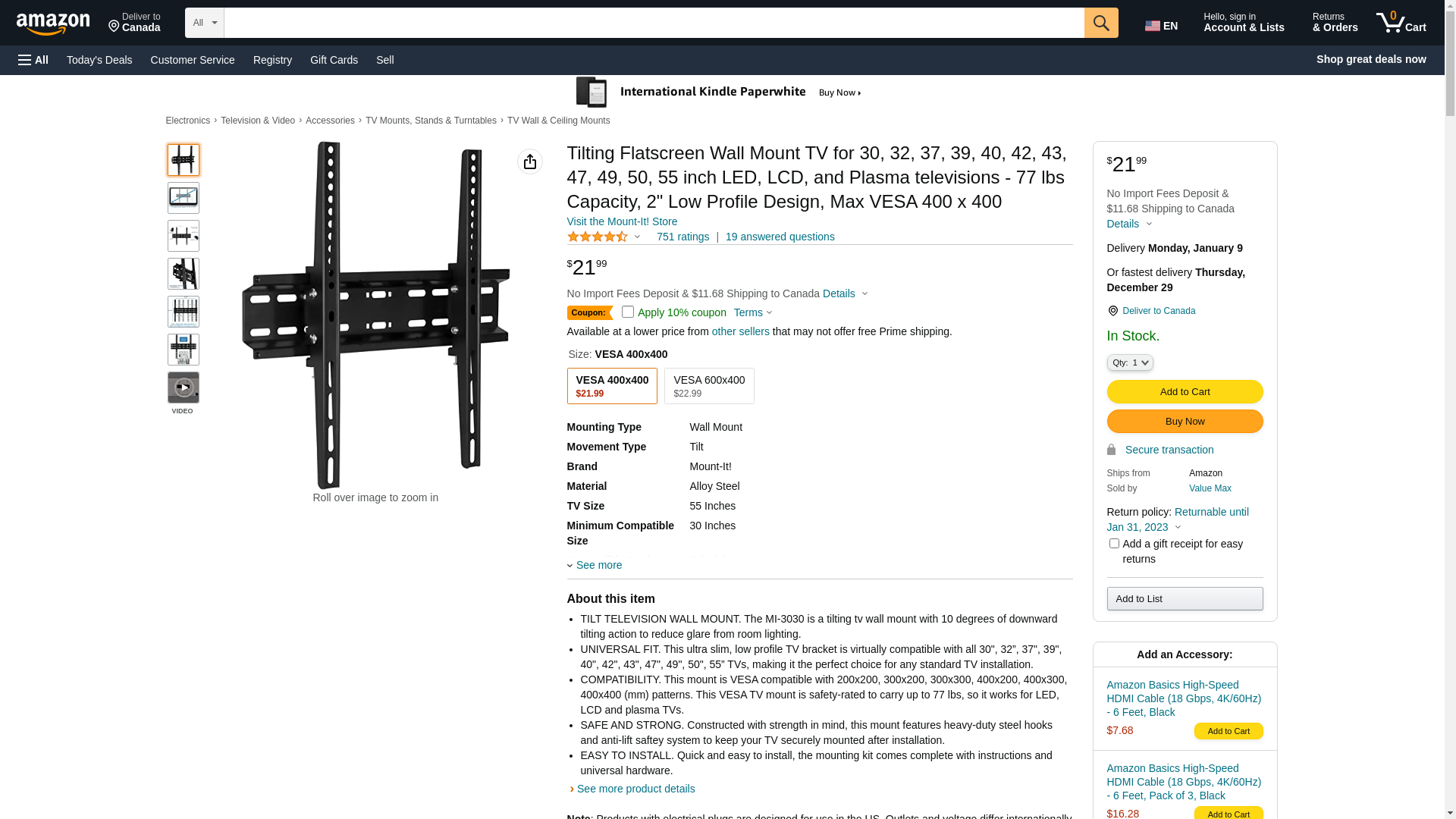 <b>PRODUCT DESCRIPTION</b> <p> Low Profile Tilt TV Wall Mount for 30” to 55” TVs <p> Buy with confidence! Mount-It! is a trusted brand with a focus on exceptional customer satisfaction. <p> The MI-3030 is designed to provide you with a no-hassle, tilting TV wall mount that is easy to install, made of heavy-duty components, and has an ultra slim profile. If you’re looking for a tilt wall mount solution, this mount checks all the boxes – and includes universal mounting hardware. The 18.3” wall bracket can be installed on standard 16” studs or solid wall surfaces. <p> <b>SPECIFICATIONS</b> <p> Screen Sizes: 30” to 55” (inches) <br> Product Dimensions: 18.3" L x 16.7" H x 2” D <br> VESA Compatibility: 200x200, 300x200, 300x300, 400x200, 400x300, 400x400 (mm) <br> Weight: 77 lbs <br> Material: Steel <br> Manual: Yes <br> Hardware Included: Yes <br> Warranty: Yes <br>
