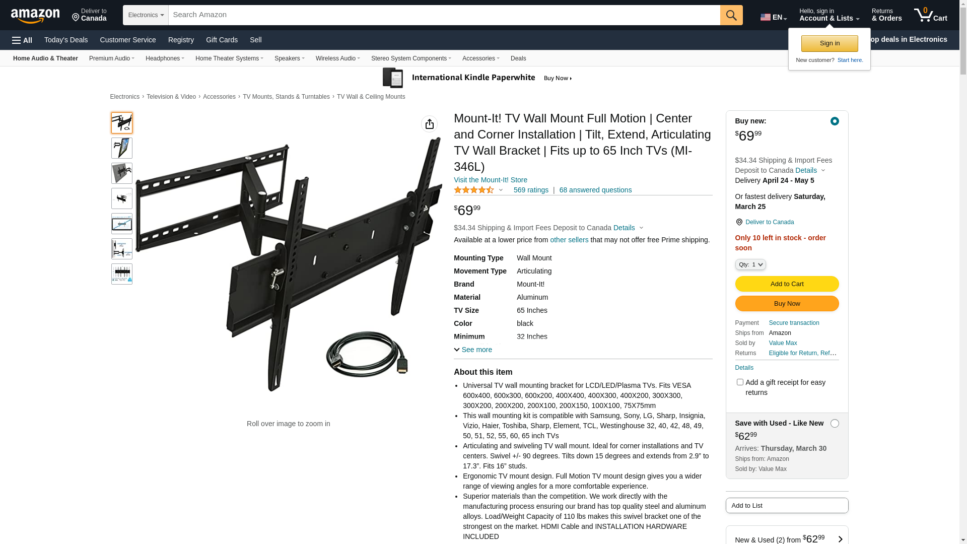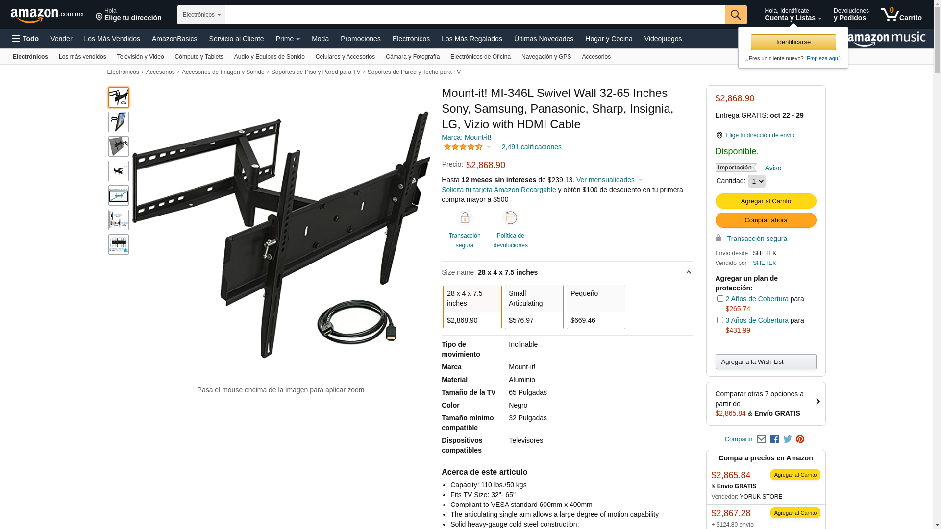 MI-346L Features: -Capacity: 110 lbs. -Construction: Solid heavy-gauge cold steel. -Articulating single arm allows a large degree of motion capability. -TV size accommodate: 32"- 65". -Compliant to VESA standard 600mm x 400mm. Mount Type: -Wall mount. Adjustability: -Tilt/Swivel/Articulating/Extending arm. Weight Capacity: -110 Pounds. Color: -Black. Compatible Screen Size: -28" - 32"/33" - 40"/41" - 46"/47" - 50"/Greater than 50". Bracket Included: -Yes. Compatible TV Brand: -Universal. Compatible TV Type: -LCD/Plasma/LED. Dimensions: -TV mounting hole dimensions: 15.7" H x 24" W. Overall Height - Top to Bottom: -16". Overall Width - Side to Side: -27.75". Overall Product Weight: -14.3 lbs. Specifications: VESA Compliant: -Yes.