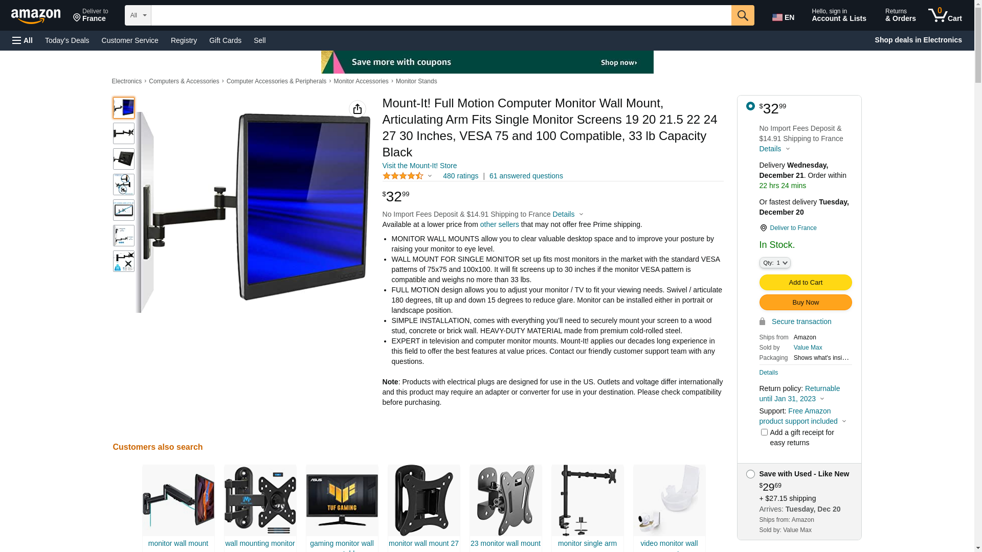 | Feature | Universal wall mountable computer monitor mounting bracket system for single monitor set up. Fits most 19-30" Monitors/TVs. Compatible with industry standard VESA patterns of 75 and 100. Weight capacity of 33 lbs. This LCD monitor arm can even fit monitors up to 30" if the monitor VESA pattern is compatible and weighs less than the weight limit. |