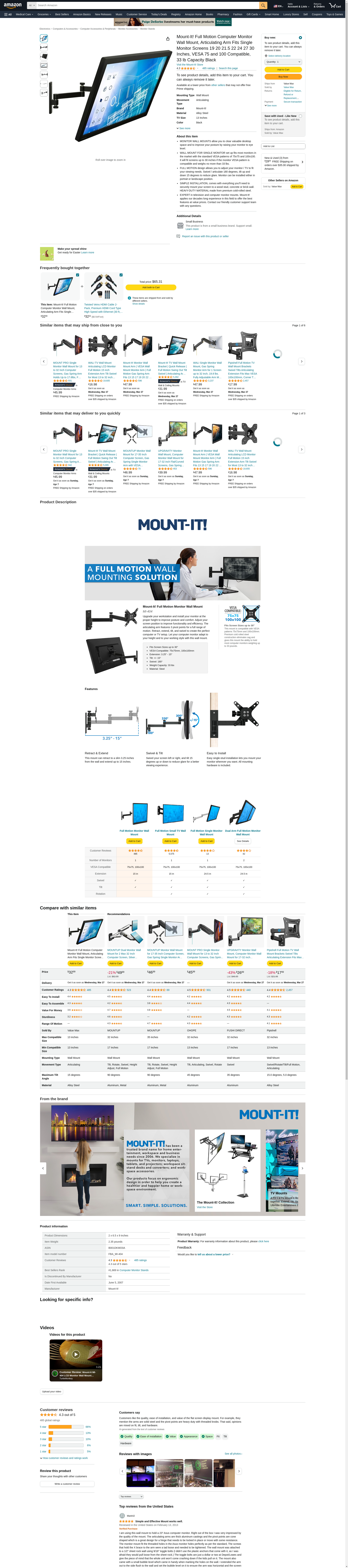 Mount-It! Full Motion Computer Monitor Wall Mount, Articulating Arm Fits Single Monitor Screens 19 20 21.5 22 24 27 30 Inches, VESA 75 and 100 Compatible, 33 lb Capacity Black
