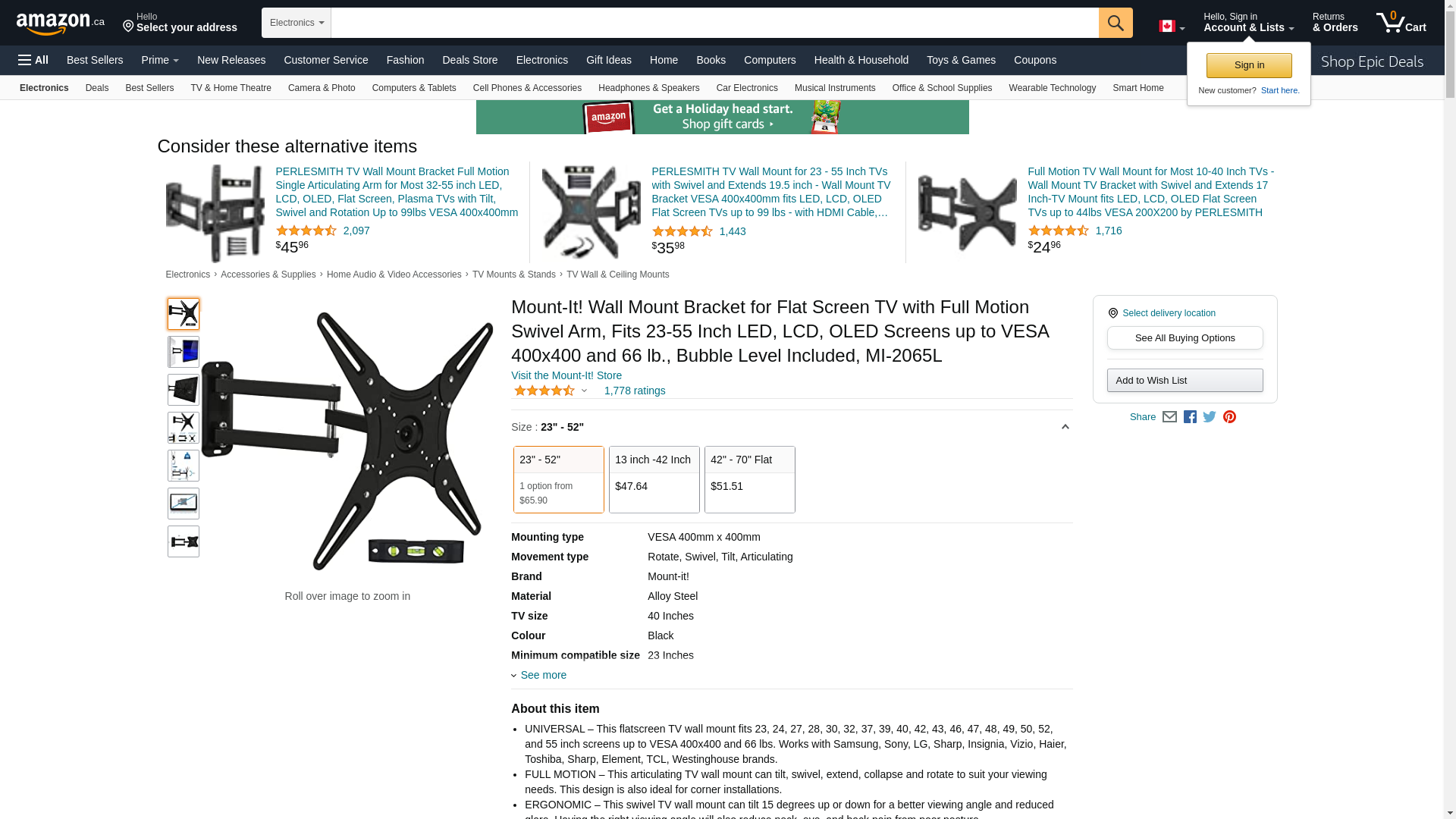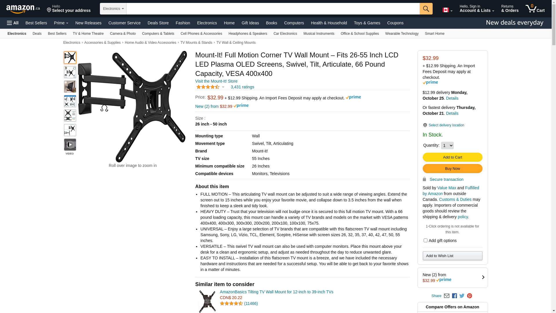 Mount-It! Full Motion TV Wall Mount Monitor Wall Bracket with Swivel and Articulating Tilt Arm, Fits 26 32 35 37 40 42 47 50 55 Inch LCD LED OLED Flat Screens up to 66 lbs and VESA 400x400 Mount-It! MI-4110 is a versatile TV wall mount for small to medium size televisions. Its articulating arm offers full motion capability to adjust your TV for optimal viewing experience. Single stud installation simplifies the placement of the TV on the wall. 15.7 inches of extension is ideal for corner installation. Simply pull the TV away from the wall and turn it left or right. This wall mount bracket is also ideal for large computer monitors, especially monitors sizes 30, 32, 34, 35 and ultrawide monitors with larger VESA patterns. Install you monitor on the to improve your posture and to clear up space on your desktop. Step-by-step instructions and all the necessary hardware is provided. Installs in minutes. Features and Specifications: Universal design fits all TVs on the market with standard VESA patterns. Fits Screen Sizes: 24, 26, 27, 30, 32, 35, 37, 38, 39, 40, 42, 43, 45, 47, 49, 50 even some 55 inch TVs. Compatible with following VESA bolt hole patterns: 75x75, 100x100, 200x100, 200x200, 300x300, 400x200 and 400x400. Load Capacity: 66 Lbs (tested to 132 lbs) Tilt: 20 Degrees up and down. Swivel: 180 degrees left and right Extension from the wall: 3.5 inch min to 15.7 inch max. Cable Management feature organizes cables for neat installation Material: High-Strength Steel