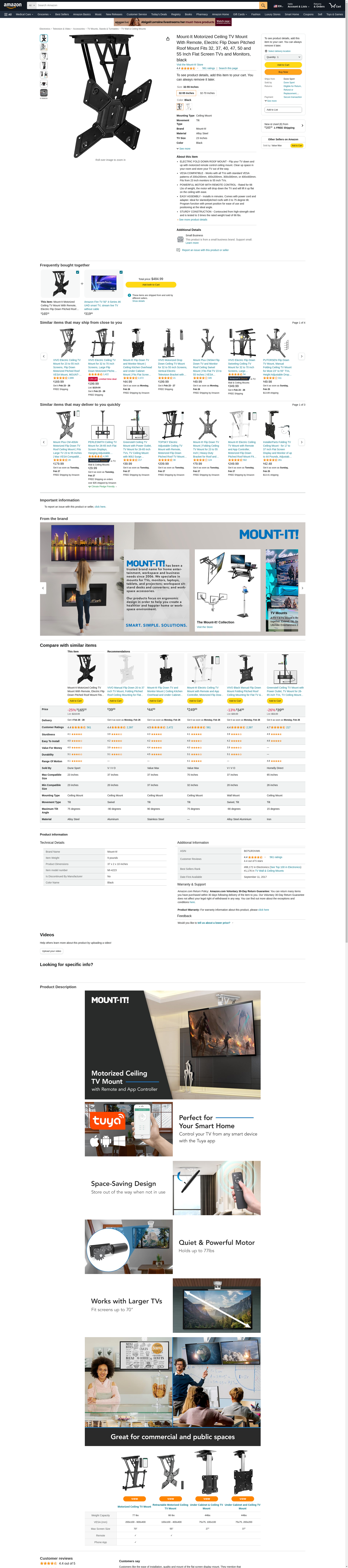MI-4223 fits TVs up to 55" in screen size and up to 66 lbs in weight Keep your TV out of the way when not in use and conveniently bring it down using the remote control when it's time to watch Easy installation and works great with pitched surfaces, featuring a 0 to 75-degree tilt Features 4 height settings for mounting the VESA head in the perfect position to adapt to any space VESA compatibility between 100x100 and 400x400 Overview This full-motion motorized TV mount keeps the TV tucked away and out of sight when not in use. Fold it down when it's time to watch with the use of the included remote control. This mount features a 0 to 75-degree tilt and works great on both a flat and pitched ceiling, providing more versatility to adapt to more spaces. A manual height adjustment of the ceiling mount can be made to ensure a comfortable viewing angle of your TV screen. It can hold up to 66lbs and fits most TV brands from 23" to 55". This flat screen TV ceiling mount comes with an instruction manual for easy installation. The powerful electric motor is surrounded by strength tested steel, making this one of our most durable TV accessories. Get your Mount-It! motorized TV wall mount today! Specifications Compatible TV Sizes: 32" - 55" Weight Capacity: 66lbs max. Tilt: 0 to 75 degrees VESA: 100x100, 200x100, 200x200, 300x300, 400x200, 400x400 Package includes: Mount, remote, installation hardware, easy-to-follow instruction manual Support MI-4223 Manual How To Reset Remote Contact Us
