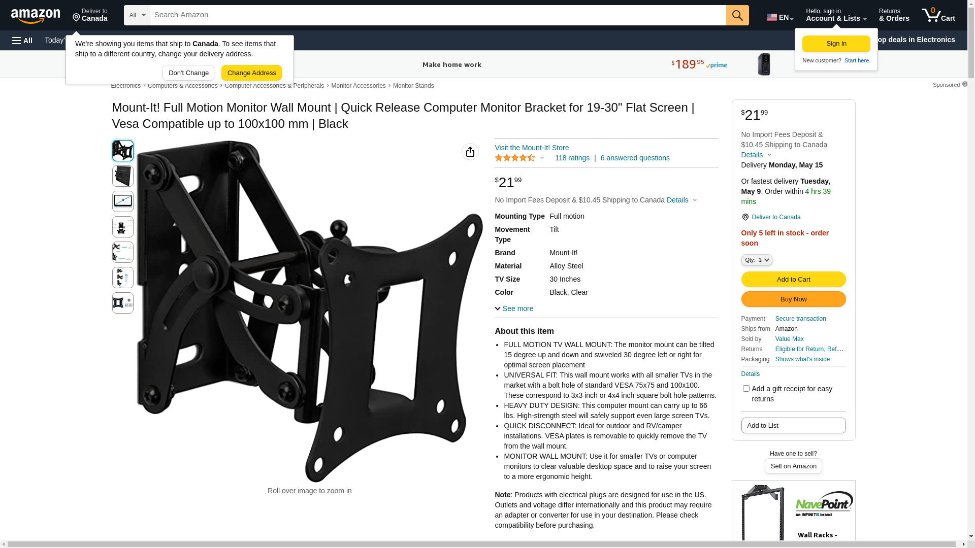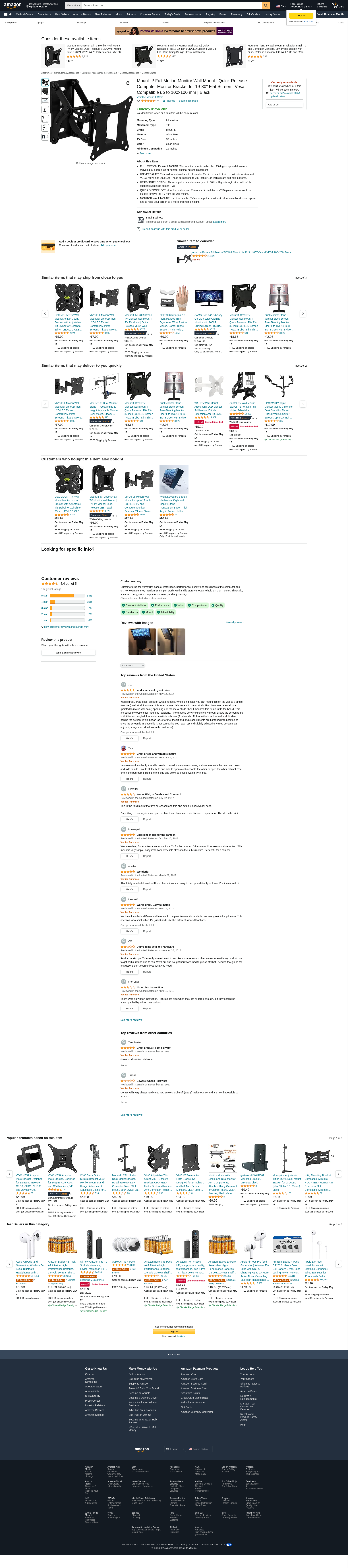 <p><strong>Mount-It! Full Motion Monitor Wall Mount | Quick Release Computer Monitor Bracket for 19-30" Flat Screen | Vesa Compatible up to 100x100 mm | Black</p></strong> <p>Looking for a heavy-duty, well-engineered, TV mount, for a 19 to 24 inches TV for your home or office? This quick-release TV mount is constructed with a thick grade of steel that will safely, secure your precious flat screen television to any wall. This articulating TV mount has a high-tech, sleek design, and has an adjustable tilt range up to 15 degrees with the ability to swivel 30 degrees at the wall plate for maximum flexibility in adjusting the side viewing angle. This durable TV mount is great for improving the appearance of any room, with the convenience of tilting your TV screen to a comfortable viewing angle. </p> <p>The use of heavy gauge metal minimizes sagging even fully extended. Compare the features and pricing to any other articulating TV wall mount on Amazon.</p> <p>Mount-It! is the expert in television and computer monitor mounts. We apply our over a decade-long experience in this field to offer the best features at value prices. Contact our friendly customer support team for any questions or issues. </p>