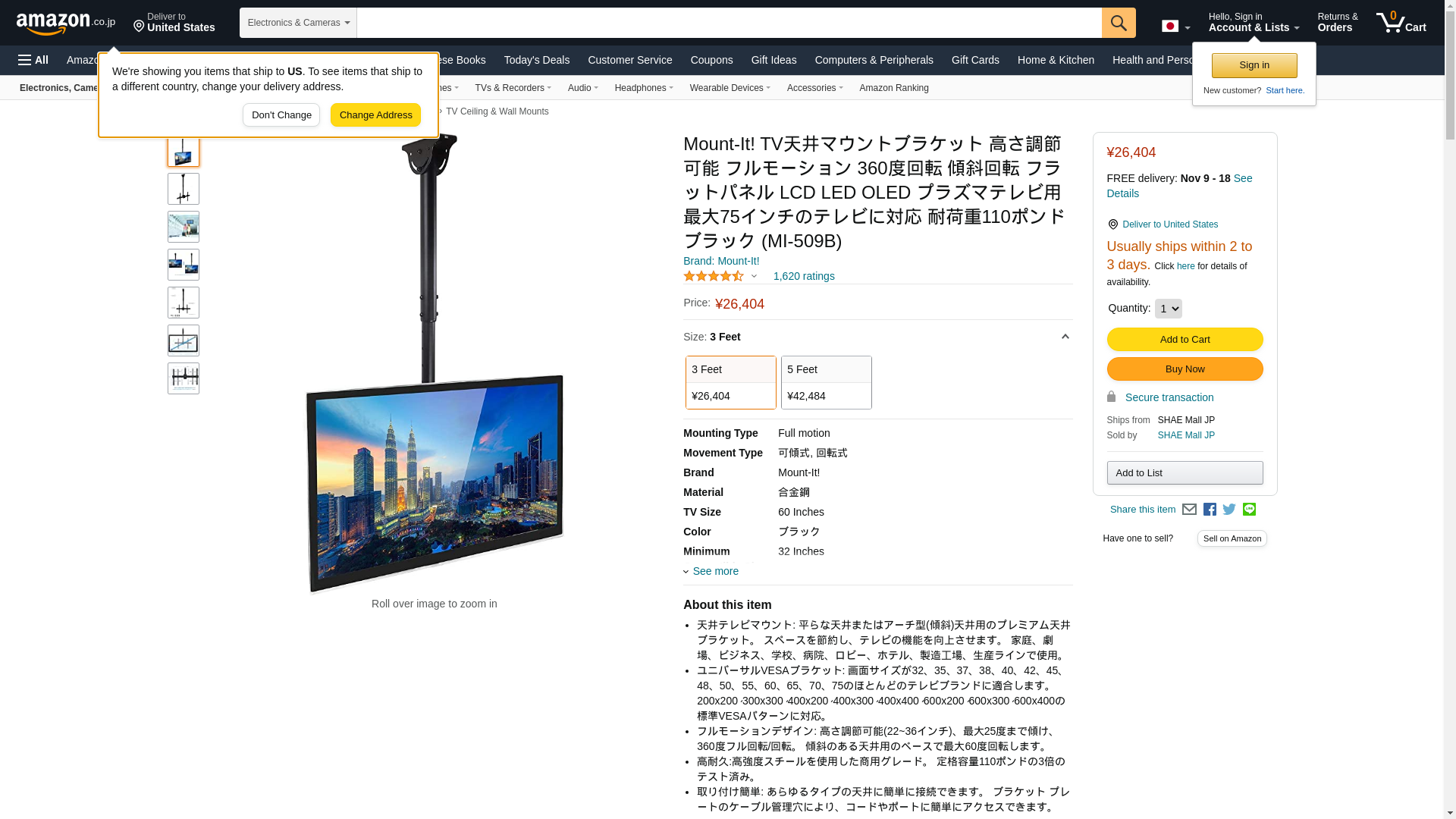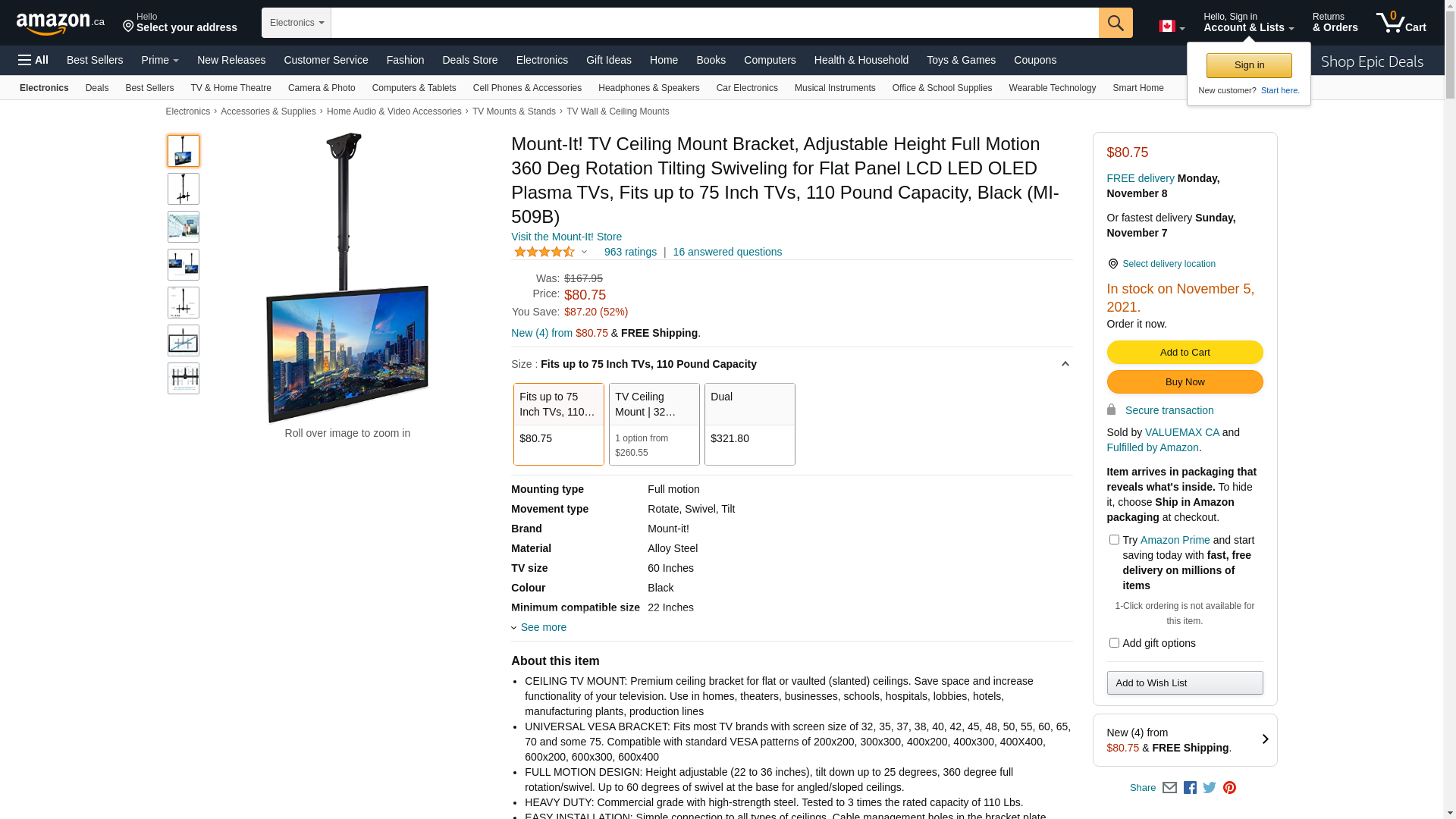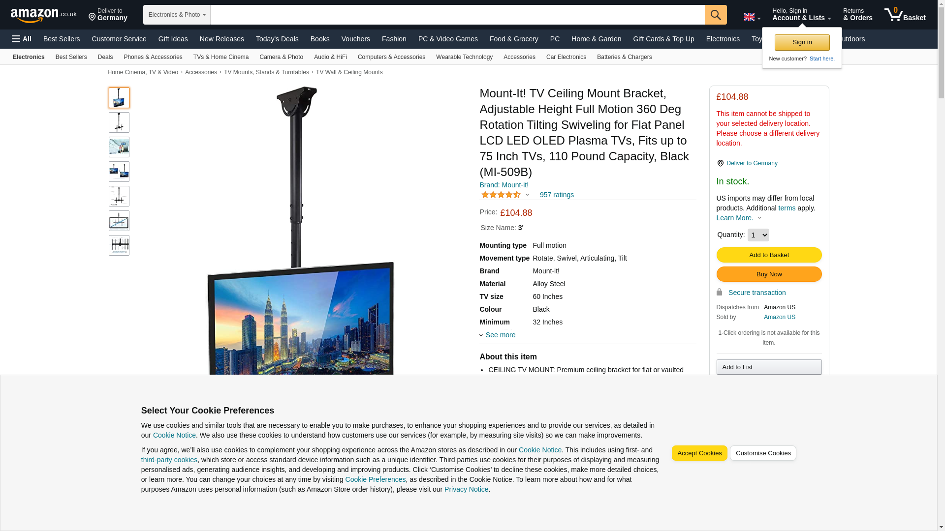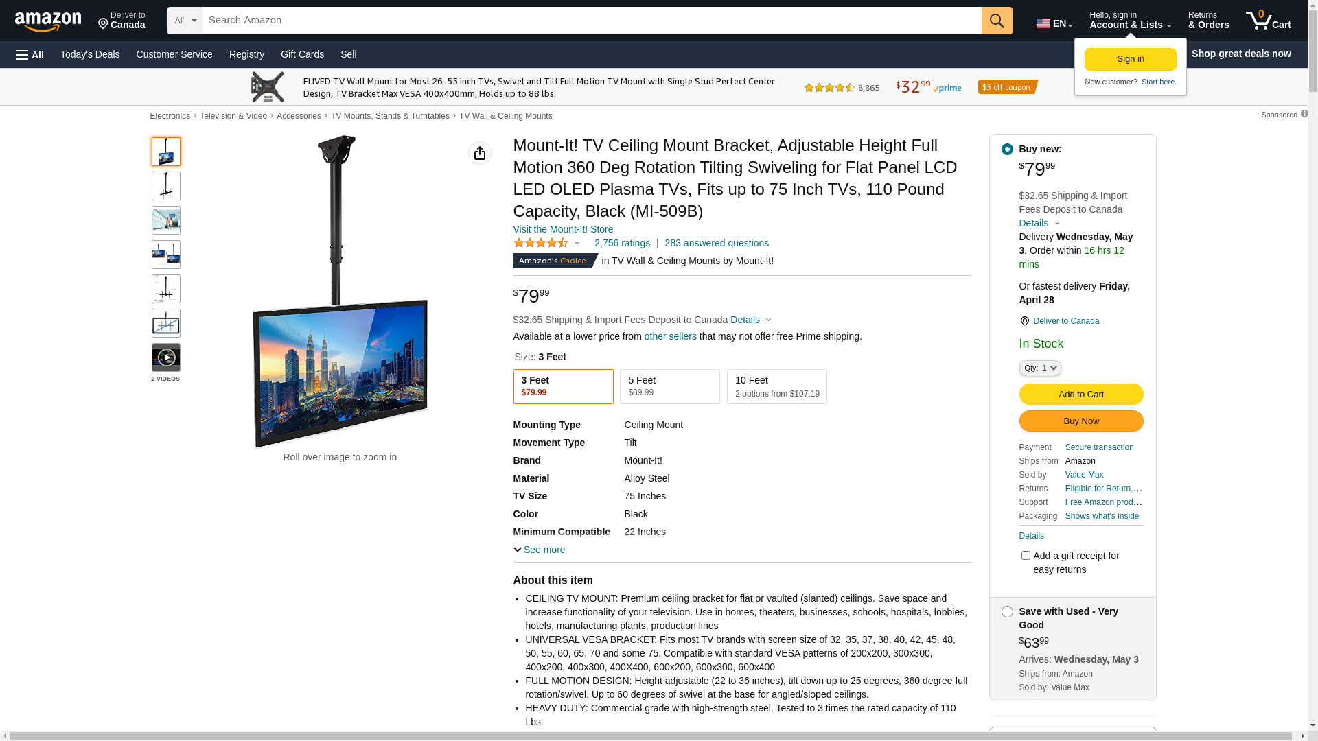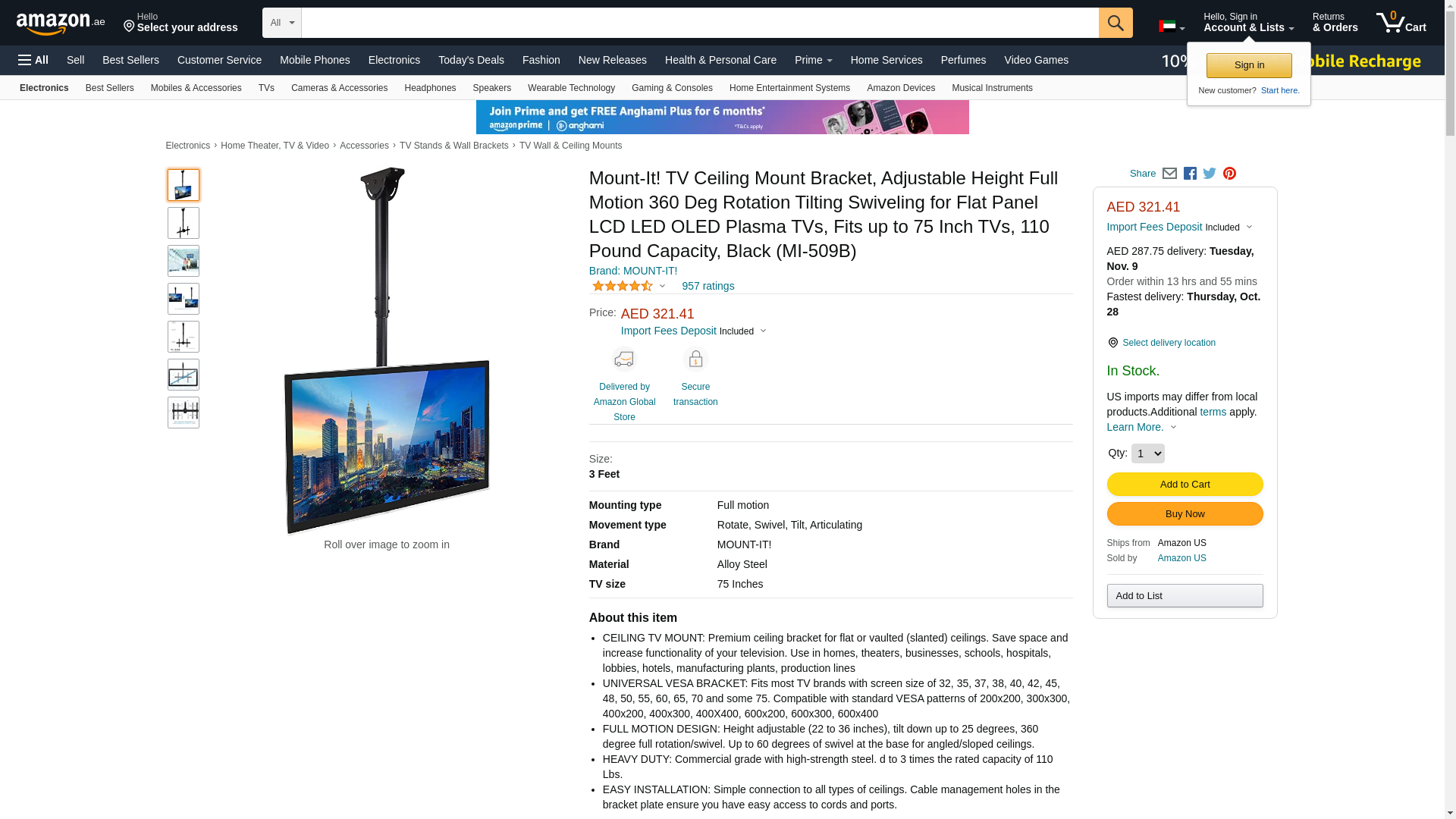 Mount-It! Ceiling TV Mount Bracket MI-509B Ideal for commercial installations with high ceilings, this TV mount extends 3 feet from the ceiling. The full motion capabilities of this mount give your screen a large range of mobility for an adaptable and comfortable environment. The universal VESA compatibility ensures that this design will endure through multiple screen upgrades or replacements, so you will never have to buy another mount. All necessary hardware and instructions are included. Screen Size: 32" - 70" VESA: 200x200 mm - 600x400 mm Max Load Capacity: 110 lbs Rotation: 360° Tilt: -25° Height Adjustment: 22" - 35.8" Cable Management: Yes