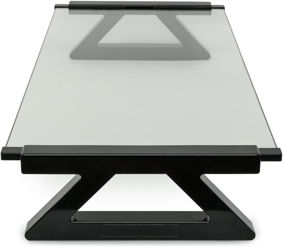 - GLASS MONITOR RISER. Elevates your monitor viewing height by 3 3/8" and creates an additional space to store office suppliers under the glass shelf.