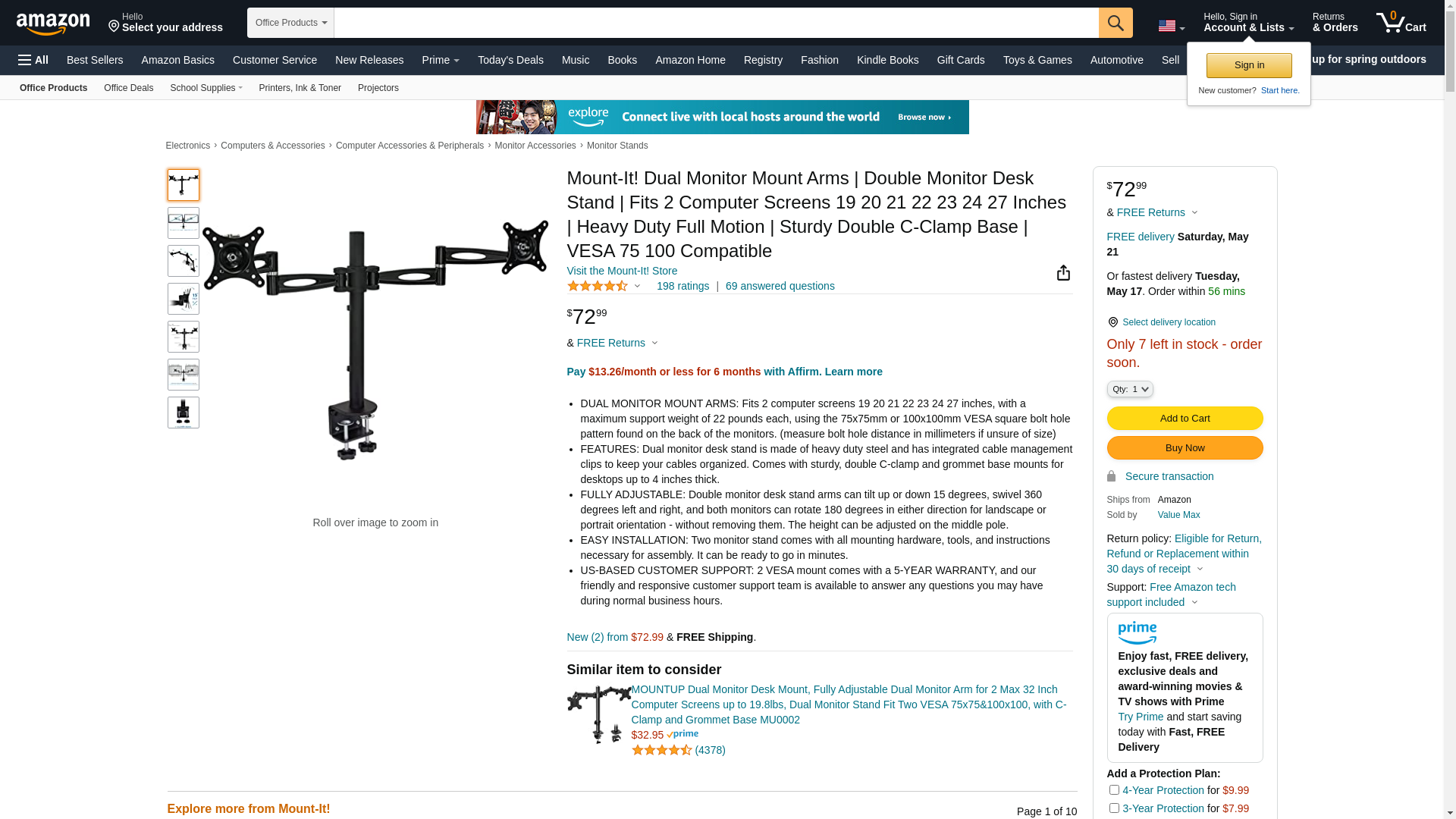 Mount-It! MI-725 dual arm monitor mount allows you to clear out your desk space, while providing ergonomic monitor installation height. Economical and dependable, mechanical monitor arms allow several height options for placing your monitor in the best ergonomic position, while offering more desktop space. The heavy duty dual C clamps secure the mount to the edge of the desk. No drilling required. The double link swing arms that support the monitors can be adjusted on the vertical tube for the best height adjustment. Articulating arms allow swivel function up to 360 degrees with 15 degrees of tilt at the mounting panel. Cup shaped monitor head allows convenient tilt and rotate adjustment. High-quality materials used at the joints allow for fluid movement, without the need to locking it in place. The arms and the base come with integrated cable management feature. Cable management system keeps cords organized. The mount is made of high grade steel and aluminum. The monitor can be installed in either portrait or landscape mode. The mounting panel can rotate to interchange from either of the modes. Lateral roll adjustment feature ensures the monitor is perfectly level after installation. Easy to install and sets up in minutes. Kit includes the mount, hardware kit and installation instructions. It is the ideal desk mount for office, reception areas, hospital, retail environments. Buy with confidence.