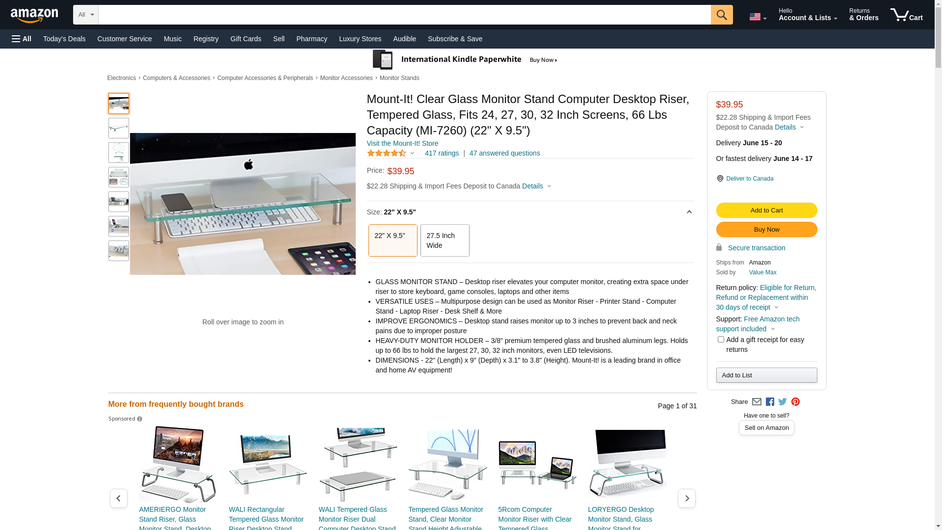 Mount-It! Clear Glass Monitor Stand Computer Desktop Riser, Tempered Glass, Fits 24, 27, 30, 32 Inch Screens, 66 Lbs Capacity (MI-7260) (22" X 9.5")