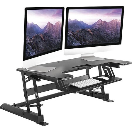 Mount-It! Standing Desk Converter, Height Adjustable Tabletop Sit Stand Desk With Keyboard Tray For Laptop and Desktop, 25" Wide Ergonomic Workstation Monitor and Desk Mount specialist Mount-It! will change the way you work! This sit-stand desk converter sits on top of your existing desk and allos you to work comfortably from either a sitting or standing position. MI-7957 provides you an easy, quick and affordable way to switch positions from sit to stand. Preventing you from sitting too long while working and allowing you to work under a most ergonomic standing position. Spring-assisted lift mechanism allows you to raise and lower it almost effortlessly in just seconds. MI-7957 gives you all the sturdiness and flexibility of Mount-It! products in a compact footprint. The desktop platform and keyboard tray are sized adequately to support laptops, keyboard and mouse side by side. The soft cushioning pad provides ergonomic comfort. Large freestanding base requires no modification to your existing desk and provides stable support. Perfect for laptops, notebooks, and tablets Fits most desks in any office or cube Ergonomic design that adjusts to most user's height Spring-assisted lift mechanism Switches from sitting to standing position in seconds Built-in keyboard tray Holds up to 17.6 lbs. of weight Easy set-up Dimensions (Weighted Base): 16.5" x 19.5" Dimensions (Desktop): 25" x 17" Dimensions (Keyboard Tray):25" x 11" Extension Height: 6.1" to 19.5” from desktop