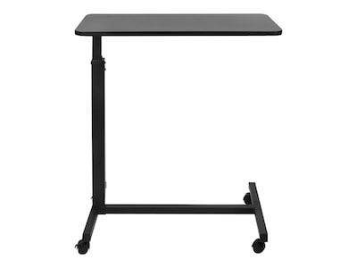 This rolling table can be used while sitting or lying down. Its special C shape design offers low clearance to roll under most chairs, sofas, and beds, making it ideal for use in hospitals, hotels, or at home. Height adjusts with a squeeze of the lever. A generous tabletop offers space for eating, reading, or computing. Four caster wheels smoothly roll across most floor surfaces in any direction. Worksurface Size: 30" x 15" Height Range: 28" - 46.5" Weight Capacity: 33 lbs Material: Particle Board & Melamine, Steel