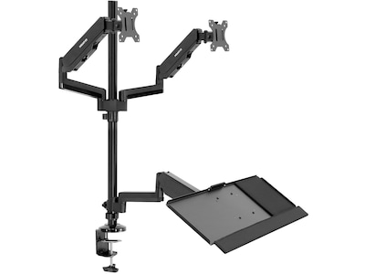 The MOUNT-IT! Dual Monitor Sit Stand Workstation is your all in one full-motion adjustable work set up that truly maximizes comfort, optimizes your productivity, and saves you space. The built-in pneumatic springs in our sit stand desk monitor mount allow for a transition from standing to sitting in seconds, giving you immediate ergonomic benefits to your neck, shoulders, and eyes, that you'll feel right away. Our monitor and keyboard desk mount also comes with a wide variety of features that increase your overall productivity while saving space at the same time. Enjoy the freedom of using two screens with an intuitive 25.5” x 9.5” keyboard tray underneath. We've included a padded wrist rest to relieve additional stress on your wrists. There's also an integrated cable management system built along the side of the frame, hiding unwanted cables and wires from sight. Enjoy the freedom and flexibility of customization in your workstation, using the pneumatic counterbalance gas springs to tilt 35°, swivel 180°, and rotate 360° so you can find the best viewing angles to fit the type of work you need to do. Using a combination of high-end steel, aluminum, and plastic, we've precision engineered the base of our sit and stand monitor mount with a C-Clamp or grommet, giving you increased stability, sturdiness, and peace of mind. Able to clamp up to 3.5" in thickness, your dual monitor standing desk will easily fit most desks, tabletops, and counters. The MOUNT-IT! Dual Monitor Sit Stand Workstation comes with a simple quick-release VESA design that's able to mount screens up 32" in size with relative ease. Installation takes less than 20 minutes, using our easy to follow instructions. Enjoy a fully functional optimized workstation and buy our dual monitor sit stand desk today!