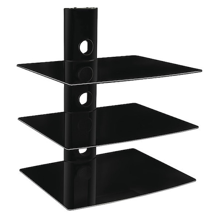 MI-803 is compatible with most devices and can hold a total capacity of 66 lbs. Oversized shelves can hold most components and have an individual capacity of 22 lbs. each Convenient cable ports and integrated back-channel keep your cables organized and concealed Sleek, black tempered glass will look elegant and modern in any living space Overview The MI-803 floating wall mounted triple glass shelf will look sleek in your living area. The black tempered glass is oversized to support various equipment. Each shelf can support up to 22 lbs. so you can store and keep your components organized. Convenient cable ports and integrated channel wire help conceal wires and keep your space tidy. Specifications Shelf Dimensions: 17.5" W x 14" D Bracket Height: 21.4" Total Weight Capacity: 66 lbs. Individual Shelf Capacity: 22 lbs. Materials: 6 mm black tempered glass Support MI-803 Manual Contact Us
