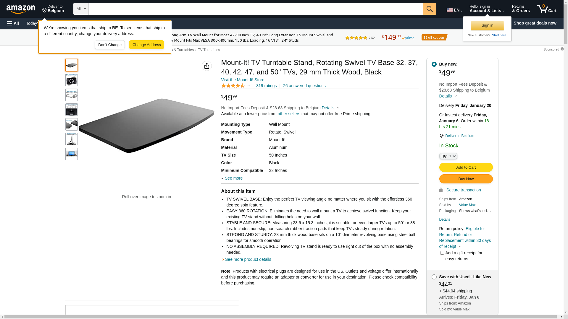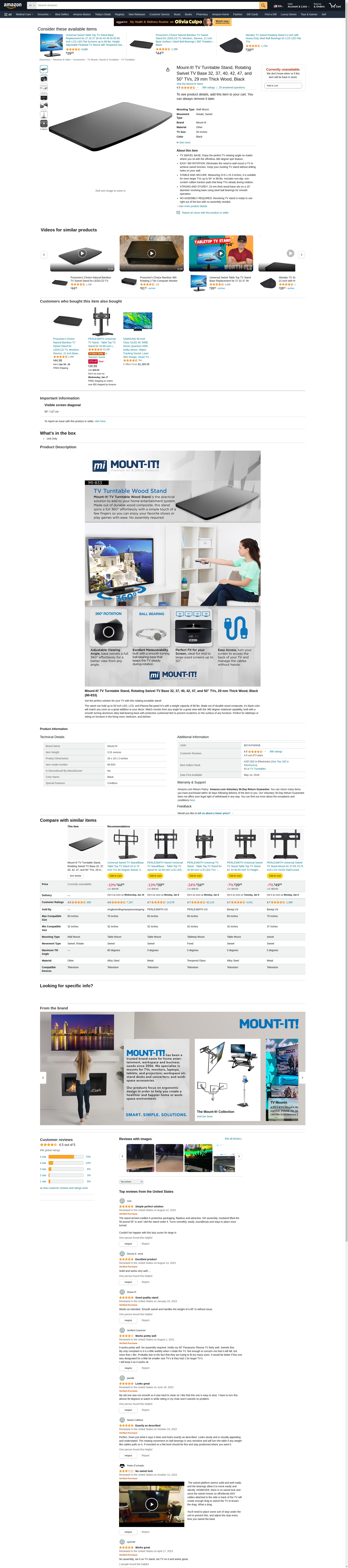 Mount-It! TV Turntable Stand, Rotating Swivel TV Base 32, 37, 40, 42, 47, and 50" TVs, 29 mm Thick Wood, Black (MI-833) Get the perfect solution for your TV with this rotating turntable stand! The stand can hold up to 50 inch LED, LCD, and Plasma flat panel tv's with a weight capacity of 88 lbs. Made out of durable wood composite, it's black color will match any room as a great addition to your decor. Watch movies from any angle for a great view with the 360 degree rotational capability, built with a smooth turning aluminum alloy ball-bearing base with protective cushioned feet to prevent scratches on the surface of any furniture. Perfect for tabletops or sitting on furniture in the living room, bedroom, and kitchen.