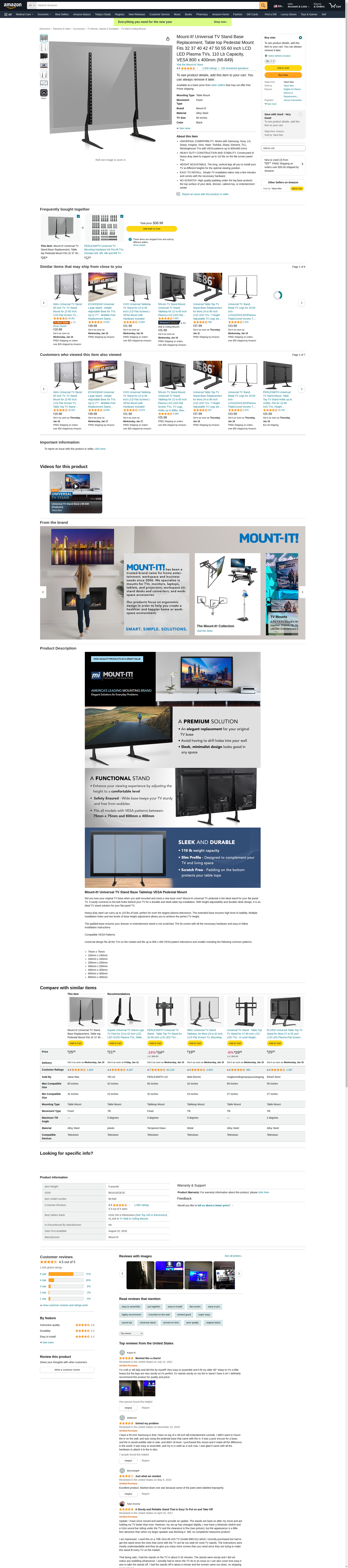 Mount-It! Universal TV Stand Base Replacement, Table top Pedestal Mount Fits 32 37 40 42 47 50 55 60 inch LCD LED Plasma TVs, 110 Lb Capacity, VESA 800 x 400mm (MI-849)