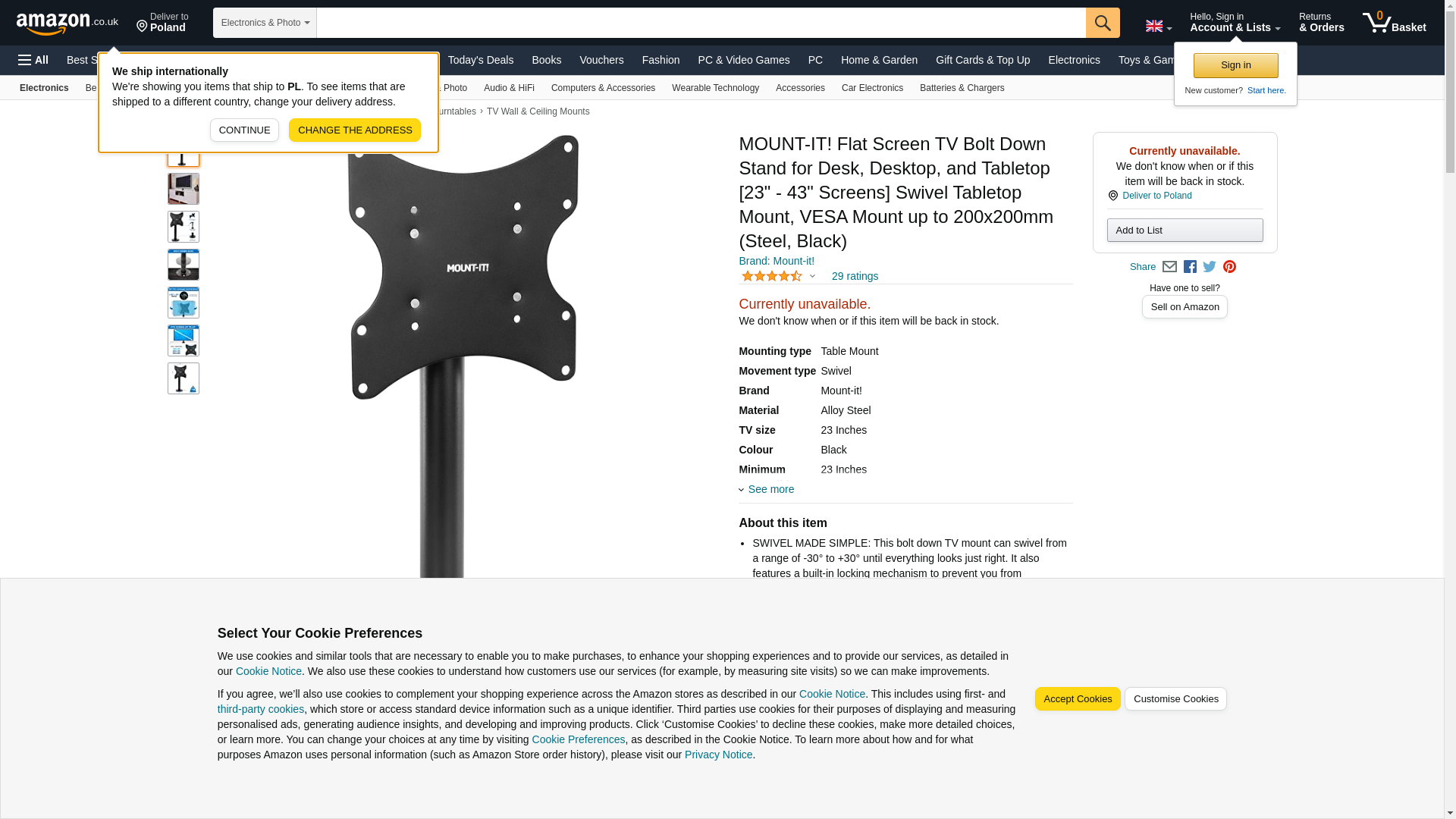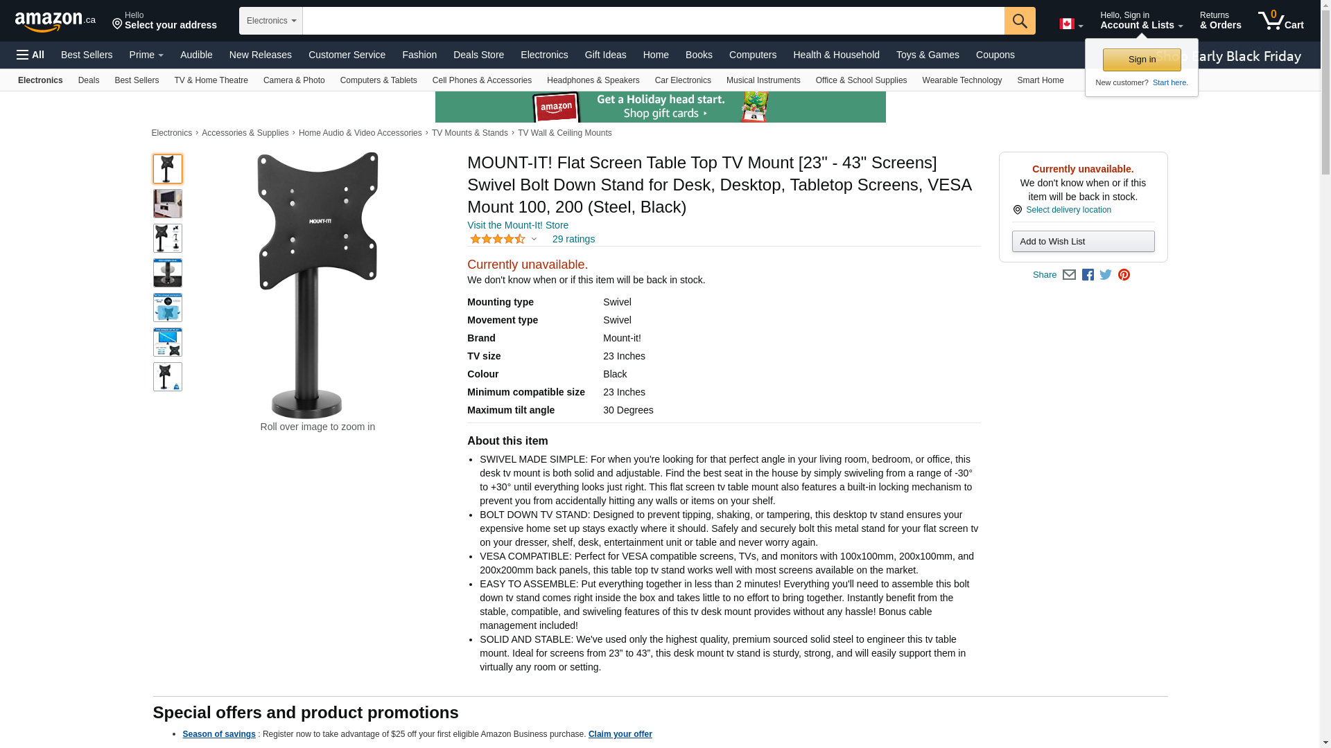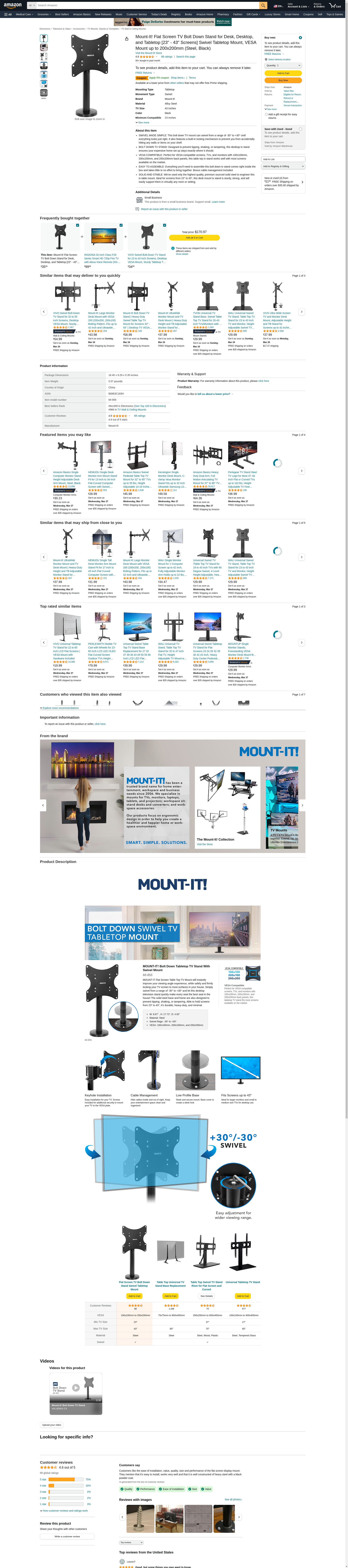 The MOUNT-IT Flat Screen Table Top TV Mount will instantly improve your viewing angle experience, while safely and firmly locking your beautiful tv screens to most surfaces in your house.<br><br> Whether you're watching alone, with a friend, or with a whole party of loved ones, simply swivel from a range of -30° to +30° and let this desktop television stand quickly make every seat the best seat in the house! This desktop tv mount also features a built-in locking mechanism to prevent you from accidentally hitting any walls or items on your shelf. <br><br> The solid steel base and frame are also designed to prevent tipping, shaking, or tampering. The MOUNT-IT Flat Screen Table Top TV Mount ensures your expensive home set up stays exactly where it should. Safely and securely bolt this table mount tv stand on your dresser, shelf, desk, entertainment unit or table in your living room, bedroom, or office. It's sleek and simple design means it will seamlessly blend into your home decor.<br><br> We've also used only the highest quality solid steel to engineer this premium swivel tabletop tv stand. Able to hold screens from 23” to 43”, it's durable, heavy-duty, and minimal. This tv desk stand will easily support your screen in nearly any room or setting.<br><br> Perfect for VESA compatible screens, TVs, and monitors with 100x100mm, 200x100mm, and 200x200mm back panels, this desktop tv mount works well with most flat screens available on the market.<br><br> Don't miss a single episode of binge watching as you easily put this tabletop swivel tv stand in less than 2 minutes! Everything you'll need to assemble it comes right inside the box and takes little to no effort to bring together. Instantly benefit from the stable, compatible, cable management and swiveling features that this tv table mount provides without any hassle! Buy the MOUNT-IT Flat Screen Table Top TV Mount today!