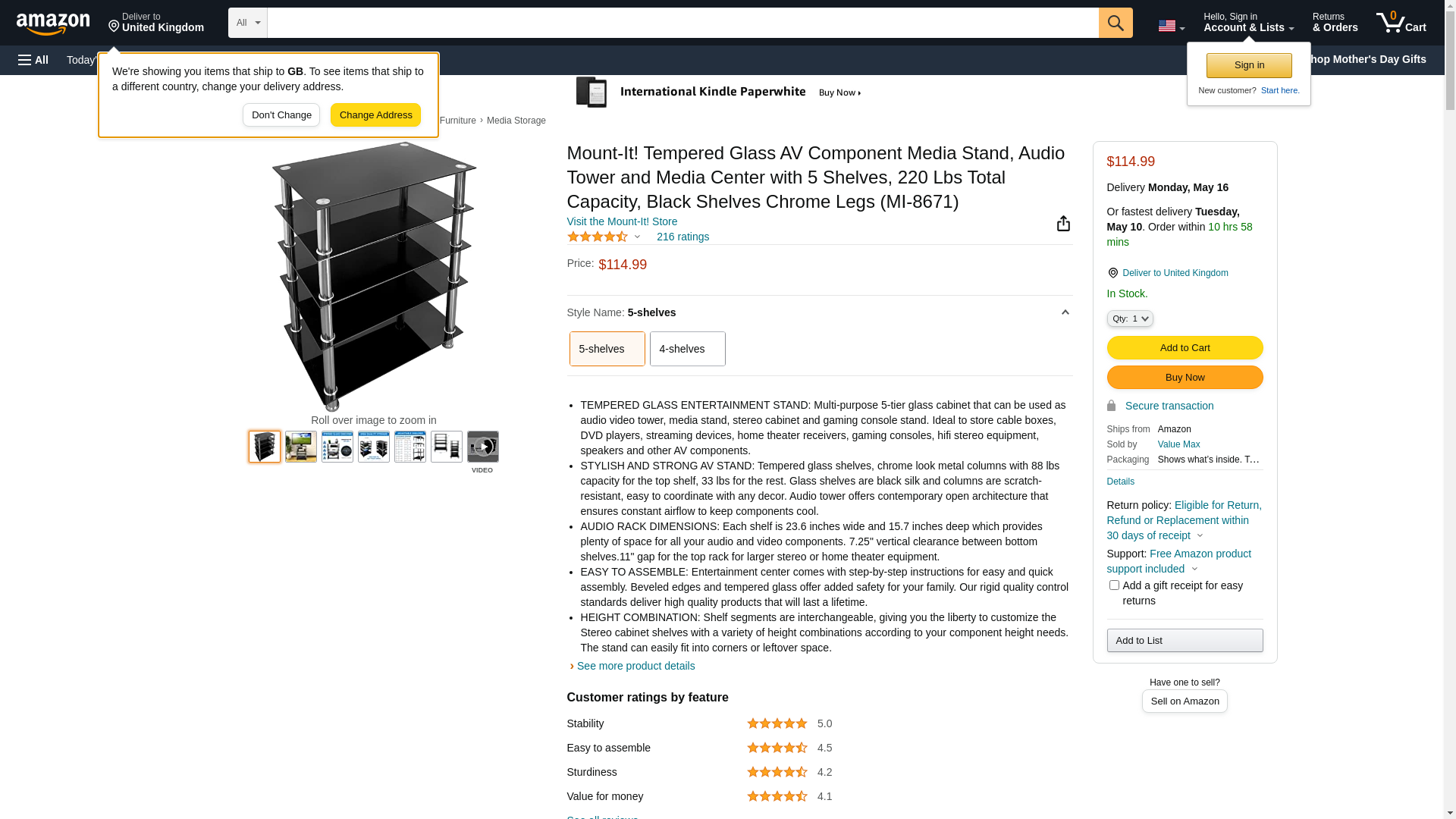 Looking for a beautiful black multi-level media component stand to complement your TV? <br> <br> Style and Grace. <br> <br> Mount-it’s MI-8671 Audio Video five tiered tower is meant to bring convenience, style, and function back into the contemporary home. The black shelves and four stainless steel supports provide a stable organizer for your sound systems. The large gaps between the tiers creates a healthy air flow for your equipment, ensuring that they don’t overheat or operate at an unsafe temperature. The alternative benefit to the open space design, is the ability to reach your products easily and conveniently without unplugging, opening, or closing anything <br> <br> Features: <br> <br> All four tiers can create a number of combinations to suit your specific needs: audiophiles can store mixers, controllers, amplifiers, switchers, routers, and pre amps. Common applications are for home theaters, gaming, speakers, amplifiers, cable boxes, servers, PCs, and TVs. <br> <br> <b> Specifications :</b> <br> <br>* Material: Tempered Glass, Metal <br>* Column Material: Steel <br>* Column Size: 1.5 Inch Diameter <br>* Column Color: Black <br>* Product Dimensions (L*W*H): 23.6*15.7*31.5 Inches <br>* Supports up to 88 lbs. <br>* Shelves: 5 <br>* Glass Finish: Black Silk Screen <br>* Glass Thickness (Top-Bottom): 6/5/5/5 mm